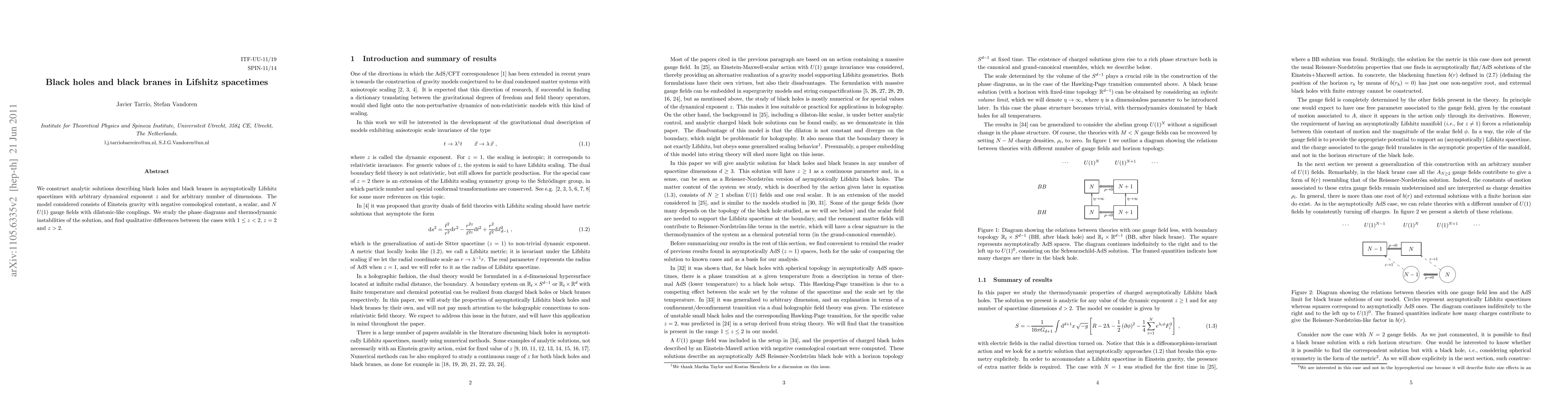 We construct analytic solutions describing black holes and black branes in asymptotically Lifshitz spacetimes with arbitrary dynamical exponent z and for arbitrary number of dimensions. The model considered consists of Einstein gravity with negative cosmological constant, a scalar, and N U(1) gauge fields with dilatonic-like couplings. We study the phase diagrams and thermodynamic instabilities of the solution, and find qualitative differences between the cases with 1<= z<2, z=2 and z>2.