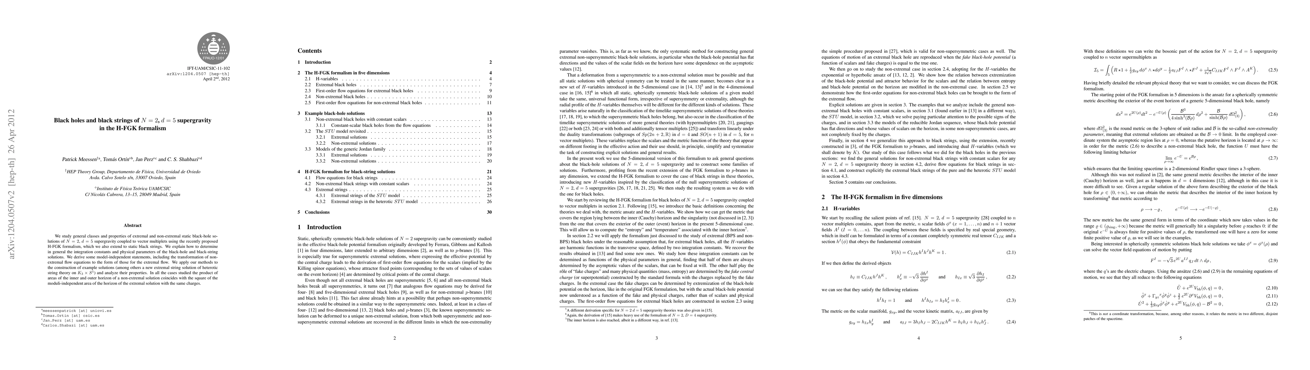 This paper explores the properties of black holes and black strings in N=2, d=5 supergravity using the H-FGK formalism, extending it to black strings and deriving model-independent statements. It constructs example solutions, including a new extremal string solution in heterotic string theory.