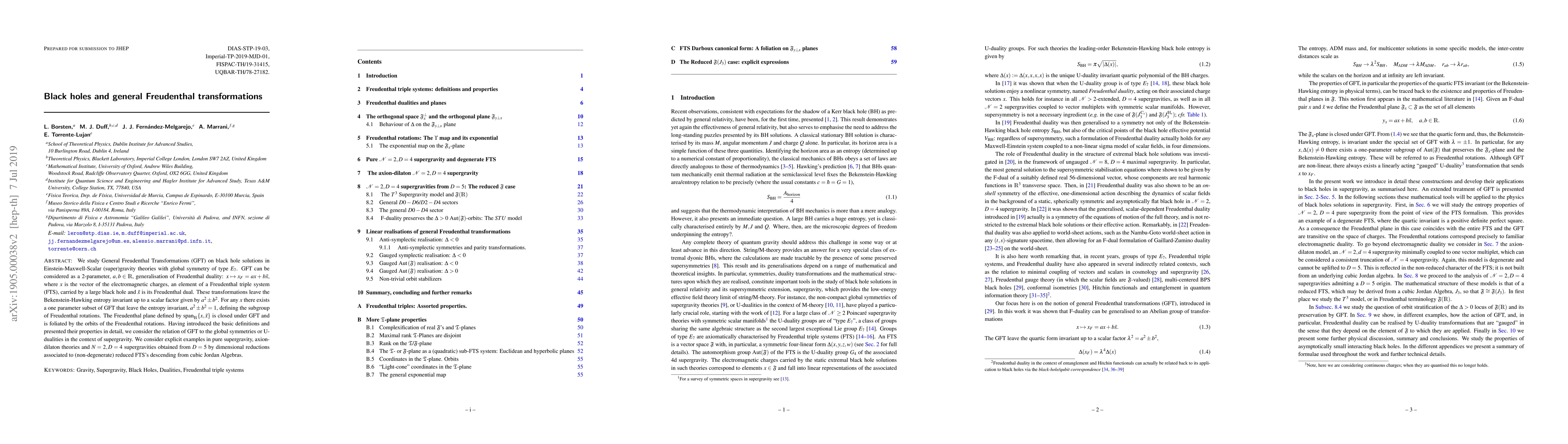We study General Freudenthal Transformations (GFT) on black hole solutions in Einstein-Maxwell-Scalar (super)gravity theories with global symmetry of type $E_7$. GFT can be considered as a 2-parameter, $a, b\in {\mathbb R}$, generalisation of Freudenthal duality: $x\mapsto x_F= a x+b\tilde{x}$, where $x$ is the vector of the electromagnetic charges, an element of a Freudenthal triple system (FTS), carried by a large black hole and $ \tilde{x}$ is its Freudenthal dual. These transformations leave the Bekenstein-Hawking entropy invariant up to a scalar factor given by $a^2\pm b^2$. For any $x$ there exists a one parameter subset of GFT that leave the entropy invariant, $a^2\pm b^2=1$, defining the subgroup of Freudenthal rotations. The Freudenthal plane defined by span$_\mathbb{R}\{x, \tilde{x}\}$ is closed under GFT and is foliated by the orbits of the Freudenthal rotations. Having introduced the basic definitions and presented their properties in detail, we consider the relation of GFT to the global sysmmetries or U-dualites in the context of supergravity. We consider explicit examples in pure supergravity, axion-dilaton theories and $N=2,D=4$ supergravities obtained from $D=5$ by dimensional reductions associated to (non-degenerate) $ reduced$ FTS's descending from cubic Jordan Algebras.