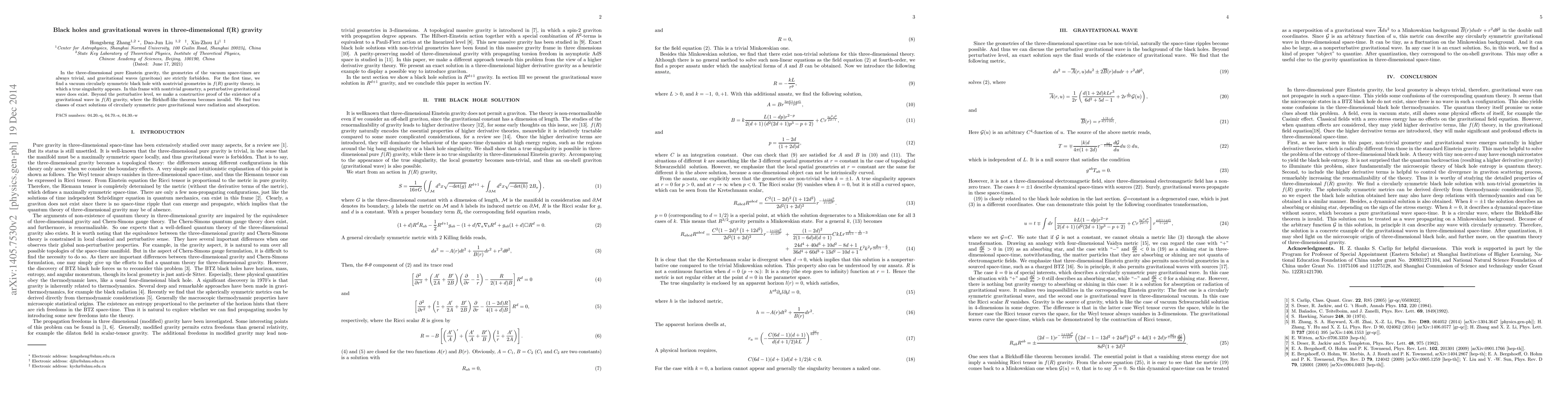 In the three-dimensional pure Einstein gravity, the geometries of the vacuum space-times are always trivial, and gravitational waves (gravitons) are strictly forbidden. For the first time, we find a vacuum circularly symmetric black hole with nontrivial geometries in $f(R)$ gravity theory, in which a true singularity appears. In this frame with nontrivial geometry, a perturbative gravitational wave does exist. Beyond the perturbative level, we make a constructive proof of the existence of a gravitational wave in $f(R)$ gravity, where the Birkhoff-like theorem becomes invalid. We find two classes of exact solutions of circularly symmetric pure gravitational wave radiation and absorption.