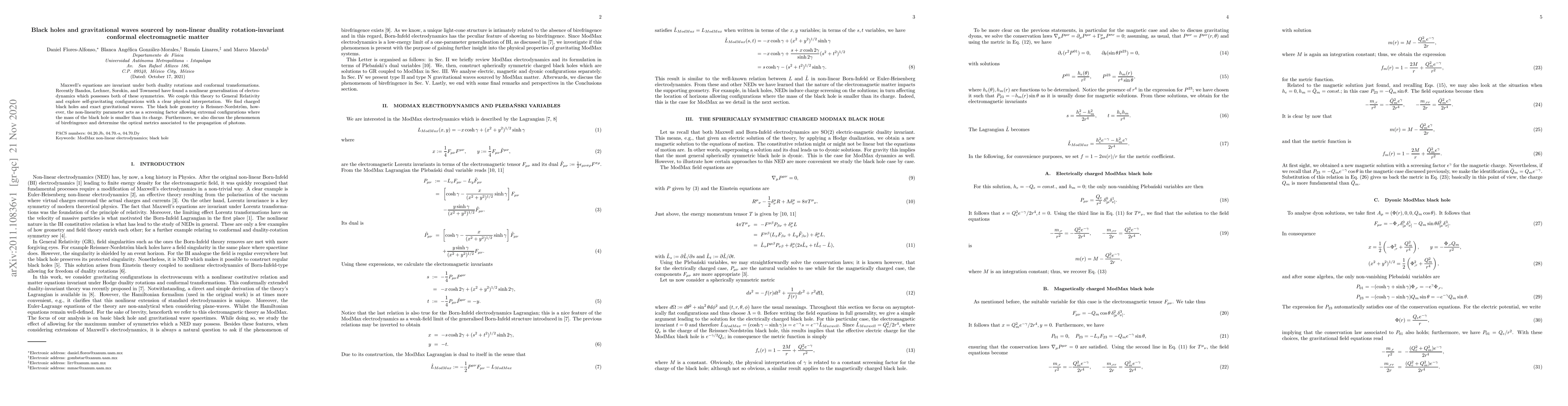 This paper explores the coupling of a nonlinear generalization of electrodynamics, possessing both duality rotations and conformal symmetries, to General Relativity, revealing charged black holes and exact gravitational waves. The study finds that the non-linear parameter acts as a screening factor, enabling extremal black holes where mass is less than charge, and discusses birefringence and associated optical metrics for photon propagation.
