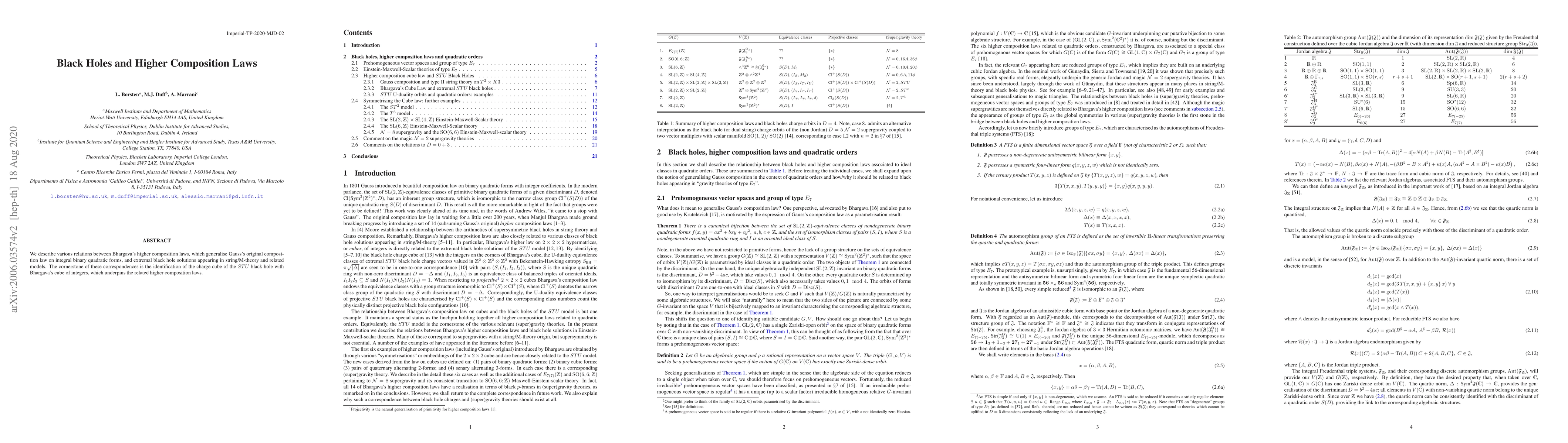 This paper explores the connections between Bhargava's higher composition laws, which extend Gauss's composition law, and extremal black hole solutions in string/M-theory. The key finding is the identification of the charge cube of STU black holes with Bhargava's cube of integers, underpinning the higher composition laws.