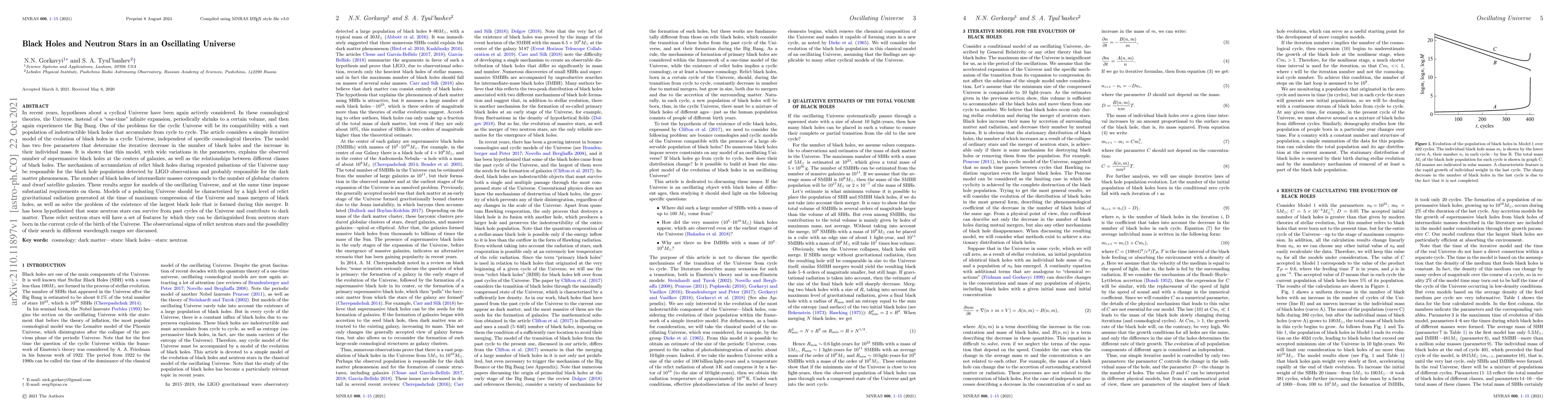 This paper explores the compatibility of cyclic Universe models with the accumulation of black holes and neutron stars across cycles, proposing a simple iterative model that explains the observed supermassive black holes and their relationships. It also hypothesizes that relict neutron stars from past cycles contribute to dark matter and discusses their distinguishing features and potential observational signatures.