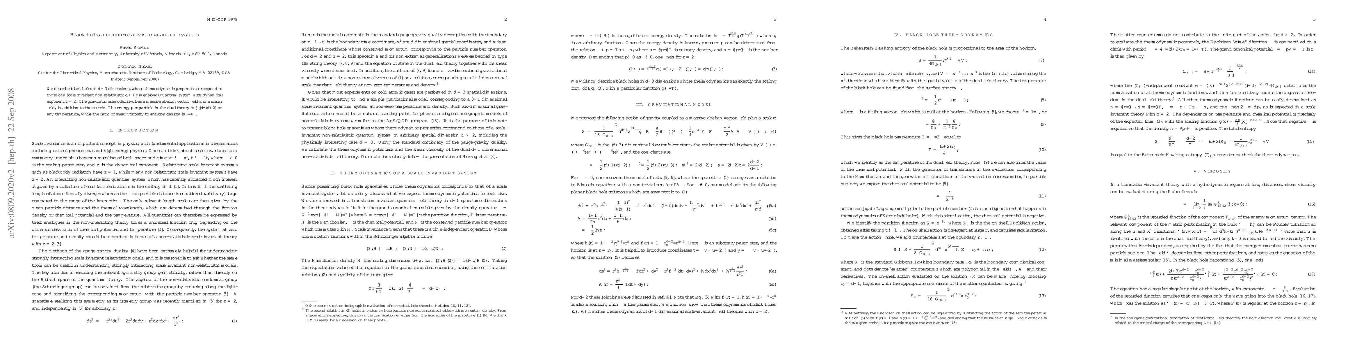 We describe black holes in d+3 dimensions, whose thermodynamic properties correspond to those of a scale invariant non-relativistic d+1 dimensional quantum system with dynamical exponent z=2. The gravitational model involves a massive abelian vector field and a scalar field, in addition to the metric. The energy per particle in the dual theory is $|\mu| d/(d+2)$, exactly as in a non-interacting Fermi gas, while the ratio of shear viscosity to entropy density is $\hbar/4\pi$.
