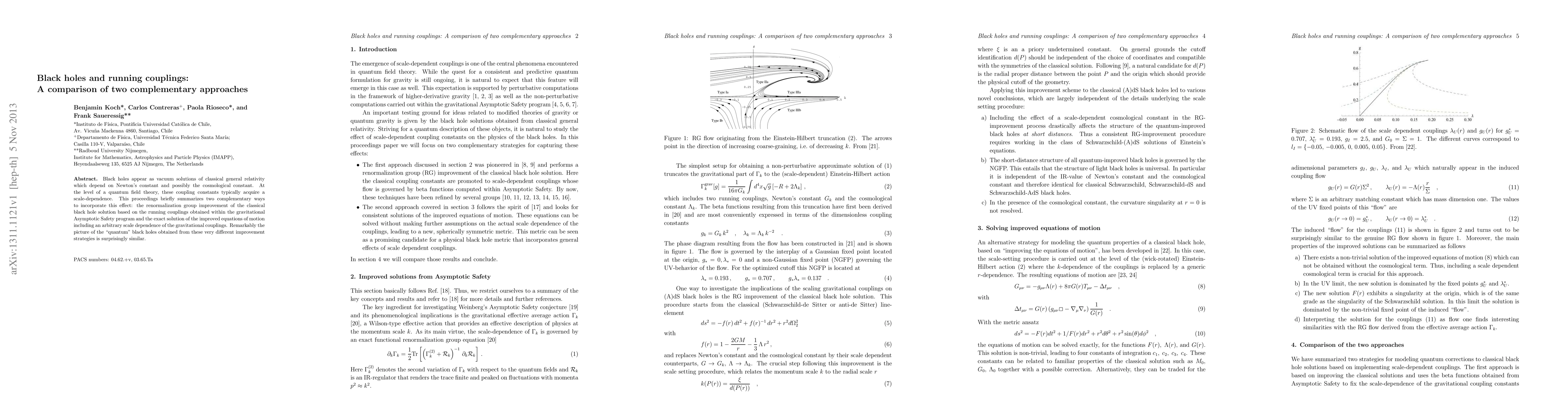 Black holes appear as vacuum solutions of classical general relativity which depend on Newton's constant and possibly the cosmological constant. At the level of a quantum field theory, these coupling constants typically acquire a scale-dependence. This proceedings briefly summarizes two complementary ways to incorporate this effect: the renormalization group improvement of the classical black hole solution based on the running couplings obtained within the gravitational Asymptotic Safety program and the exact solution of the improved equations of motion including an arbitrary scale dependence of the gravitational couplings. Remarkably the picture of the "quantum" black holes obtained from these very different improvement strategies is surprisingly similar.