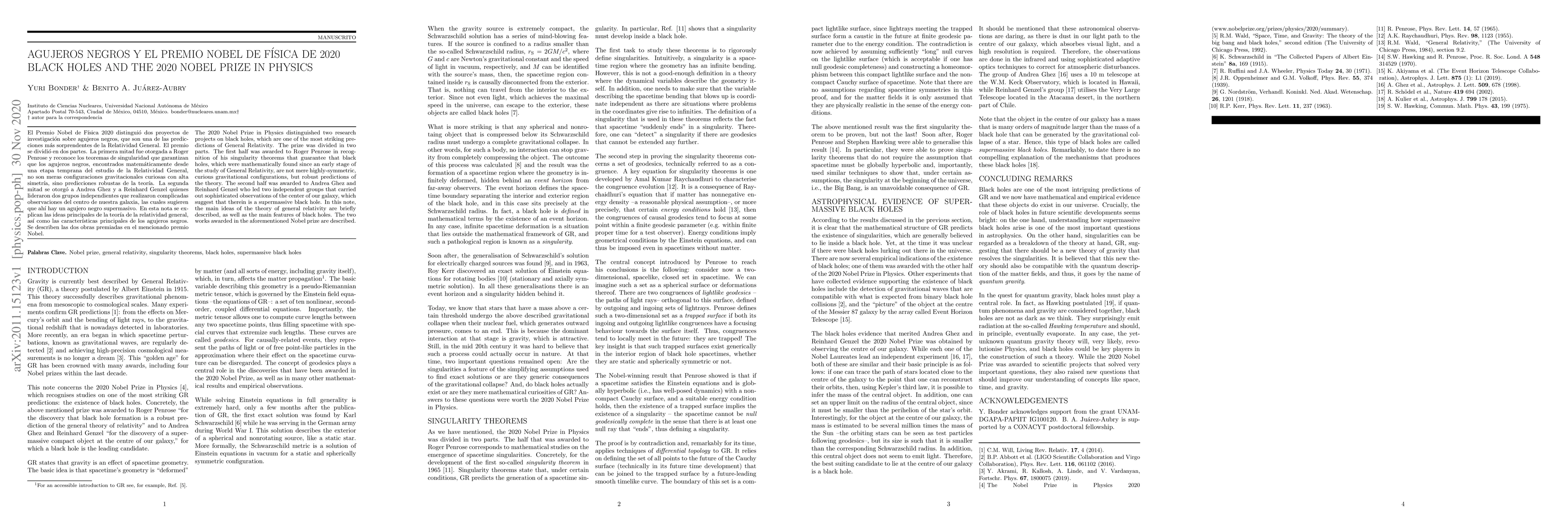 The 2020 Nobel Prize in Physics distinguished two research projects on black holes, which are one of the most striking predictions of General Relativity. The prize was divided in two parts. The first half was awarded to Roger Penrose in recognition of his singularity theorems that guarantee that black holes, which were mathematically found since an early stage of the study of General Relativity, are not mere highly-symmetric, curious gravitational configurations, but robust predictions of the theory. The second half was awarded to Andrea Ghez and Reinhard Genzel who led two independent groups that carried out sophisticated observations of the center of our galaxy, which suggest that therein is a supermassive black hole. In this note, the main ideas of the theory of general relativity are briefly described, as well as the main features of black holes. The two works awarded in the aforementioned Nobel prize are described.