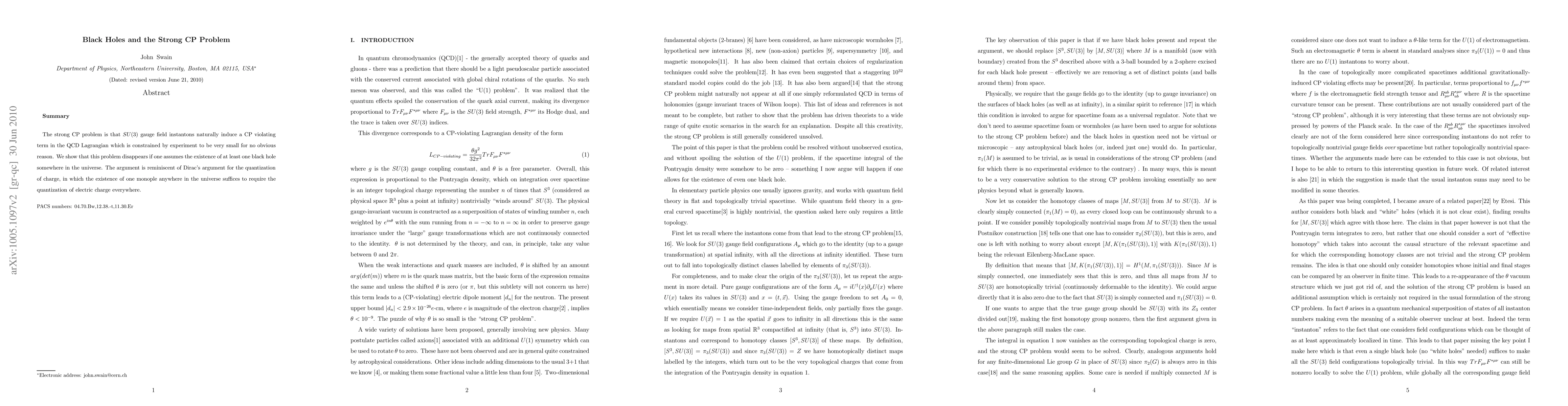 The strong CP problem is that SU(3) gauge field instantons naturally induce a CP violating term in the QCD Lagrangian which is constrained by experiment to be very small for no obvious reason. We show that this problem disappears if one assumes the existence of at least one black hole somewhere in the universe. The argument is reminiscent of Dirac's argument for the quantization of charge, in which the existence of one monople anywhere in the universe suffices to require the quantization of electric charge everywhere.