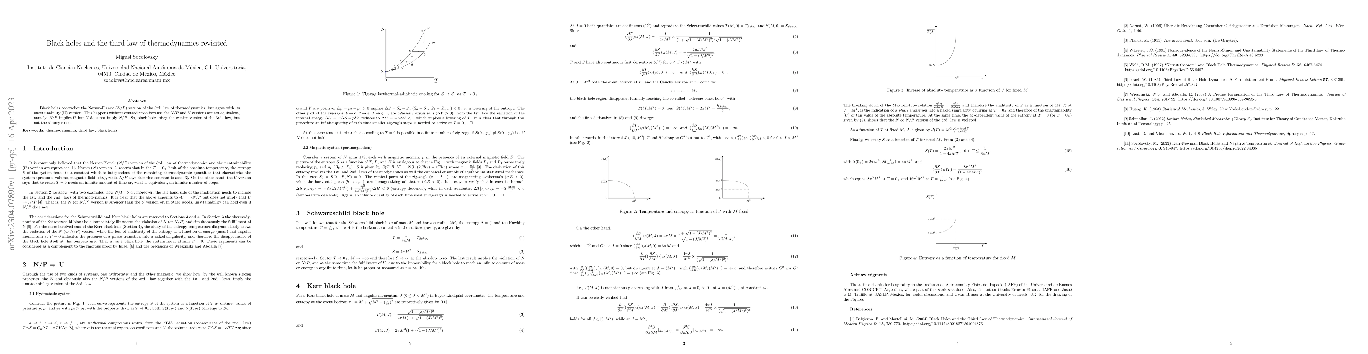 The paper revisits the Third Law of Thermodynamics in the context of black holes, comparing the Nernst-Planck (N/P) and unattainability (U) versions, and analyzing Schwarzschild and Kerr black holes.