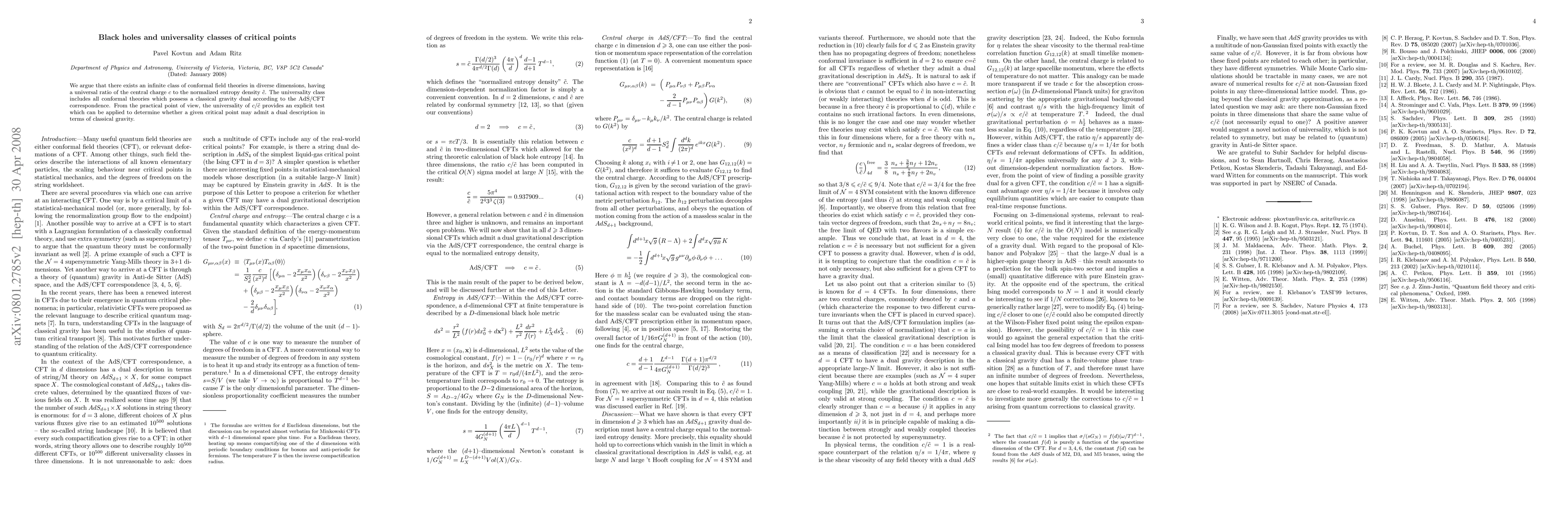 We argue that there exists an infinite class of conformal field theories in diverse dimensions, having a universal ratio of the central charge c to the normalized entropy density c'. The universality class includes all conformal theories which possess a classical gravity dual according to the AdS/CFT correspondence. From the practical point of view, the universality of c/c' provides an explicit test which can be applied to determine whether a given critical point may admit a dual description in terms of classical gravity.