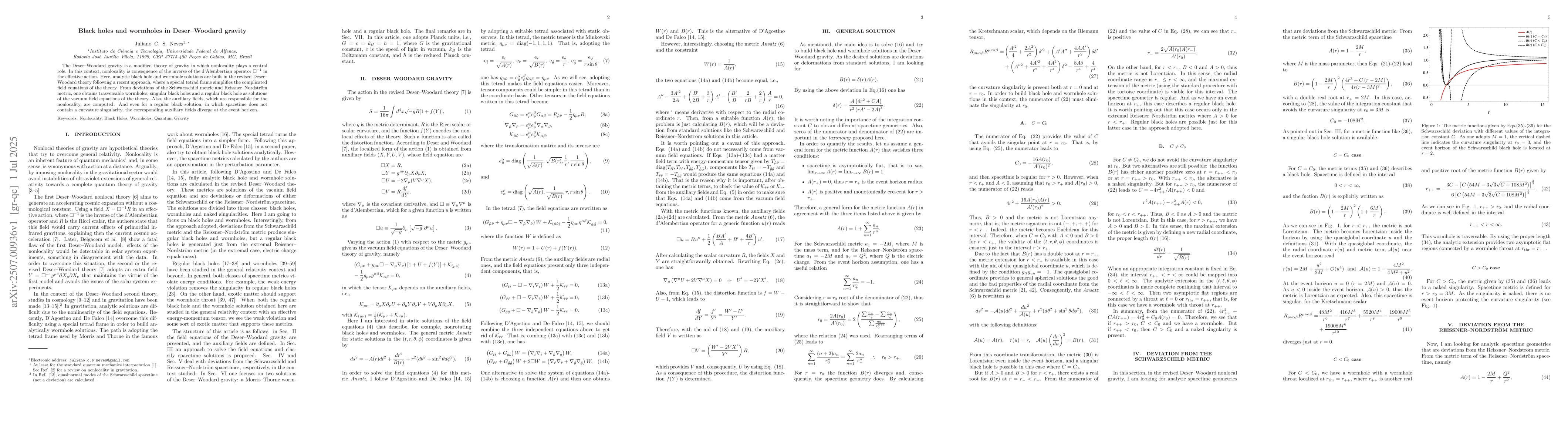 The Deser-Woodard gravity is a modified theory of gravity in which nonlocality plays a central role. In this context, nonlocality is consequence of the inverse of the d'Alembertian operator $\square^{-1}$ in the effective action. Here, analytic black hole and wormhole solutions are built in the revised Deser-Woodard theory following a recent approach, where a special tetrad frame simplifies the complicated field equations of the theory. From deviations of the Schwarzschild metric and Reissner-Nordstr\"om metric, one obtains trasversable wormholes, singular black holes and a regular black hole as solutions of the vacuum field equations of the theory. Also, the auxiliary fields, which are responsible for the nonlocality, are computed. And even for a regular black solution, in which spacetime does not contain a curvature singularity, the corresponding auxiliary fields diverge at the event horizon.