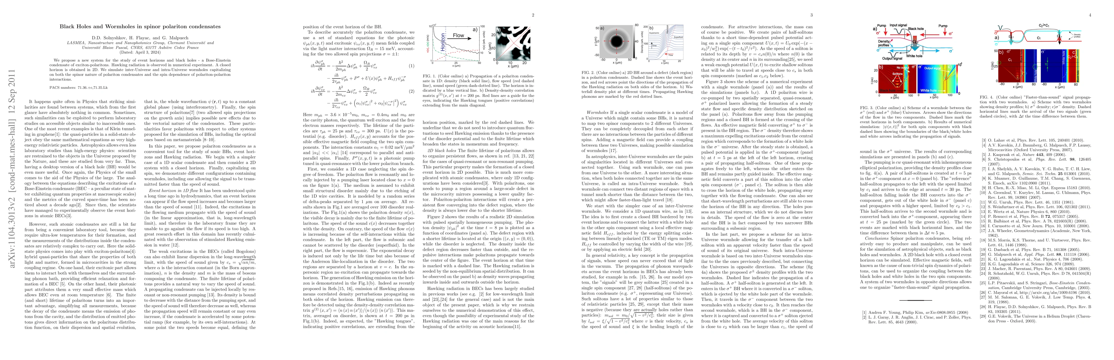 This paper proposes a Bose-Einstein condensate of exciton-polaritons as a novel system to study event horizons and black holes, observing Hawking radiation in numerical simulations. The research also explores the simulation of wormholes, both inter-Universe and intra-Universe, leveraging the spinor properties and spin-dependent interactions of polariton condensates.