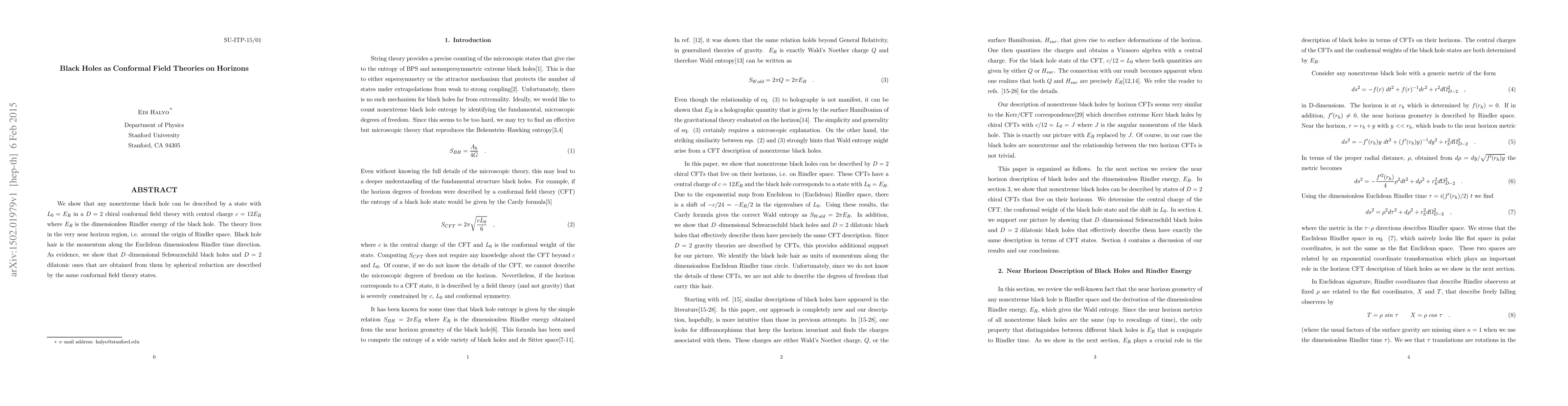 We show that any nonextreme black hole can be described by a state with $L_0=E_R$ in a $D=2$ chiral conformal field theory with central charge $c=12E_R$ where $E_R$ is the dimensionless Rindler energy of the black hole. The theory lives in the very near horizon region, i.e. around the origin of Rindler space. Black hole hair is the momentum along the Euclidean dimensionless Rindler time direction. As evidence, we show that $D$--dimensional Schwarzschild black holes and $D=2$ dilatonic ones that are obtained from them by spherical reduction are described by the same conformal field theory states.