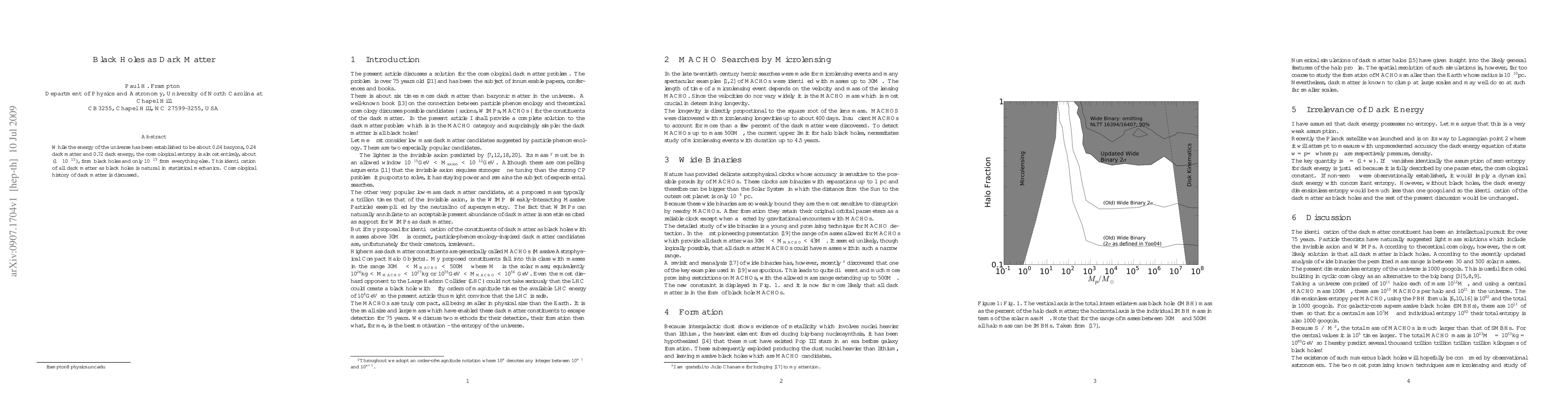 While the energy of the universe has been established to be about 0.04 baryons, 0.24 dark matter and 0.72 dark energy, the cosmological entropy is almost entirely, about $(1 - 10^{-15})$, from black holes and only $10^{-15}$ from everything else. This identification of all dark matter as black holes is natural in statistical mechanics. Cosmological history of dark matter is discussed.