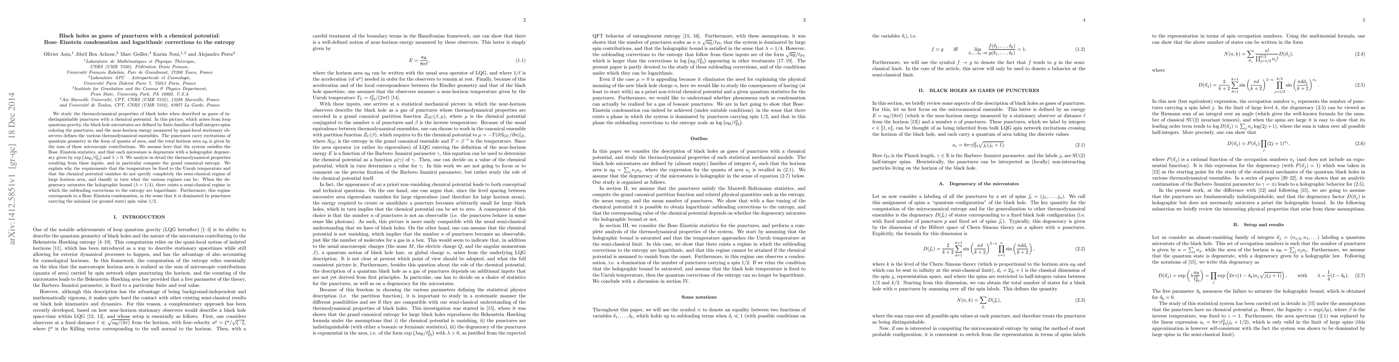 Researchers describe black holes as gases of punctures with a chemical potential, exploring thermodynamical properties and finding that at large horizon areas, subleading corrections to entropy become logarithmic, indicating a Bose-Einstein condensation.
