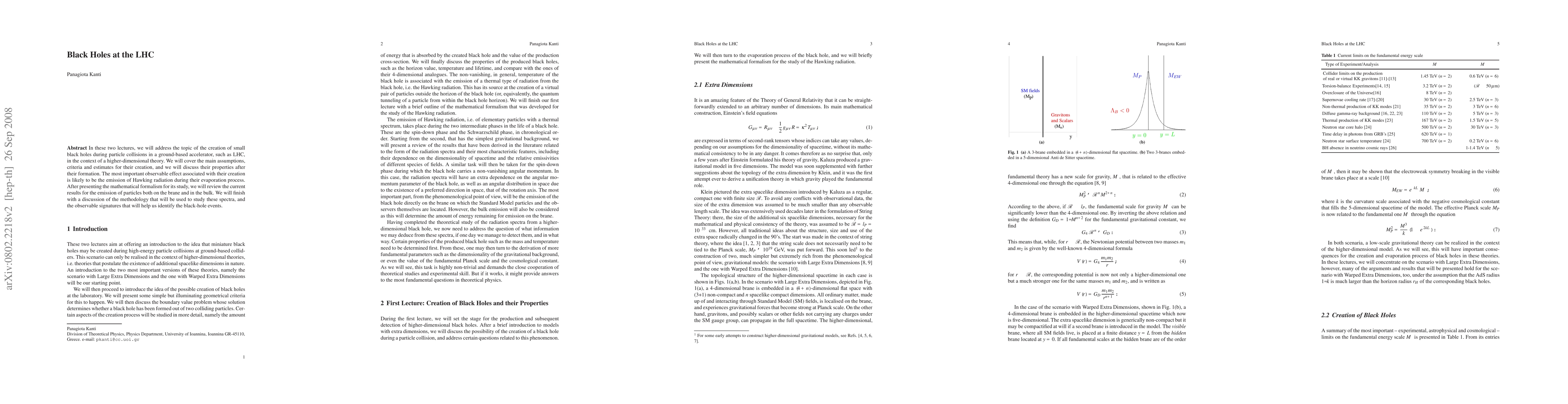 In these two lectures, we will address the topic of the creation of small black holes during particle collisions in a ground-based accelerator, such as LHC, in the context of a higher-dimensional theory. We will cover the main assumptions, criteria and estimates for their creation, and we will discuss their properties after their formation. The most important observable effect associated with their creation is likely to be the emission of Hawking radiation during their evaporation process. After presenting the mathematical formalism for its study, we will review the current results for the emission of particles both on the brane and in the bulk. We will finish with a discussion of the methodology that will be used to study these spectra, and the observable signatures that will help us identify the black-hole events.