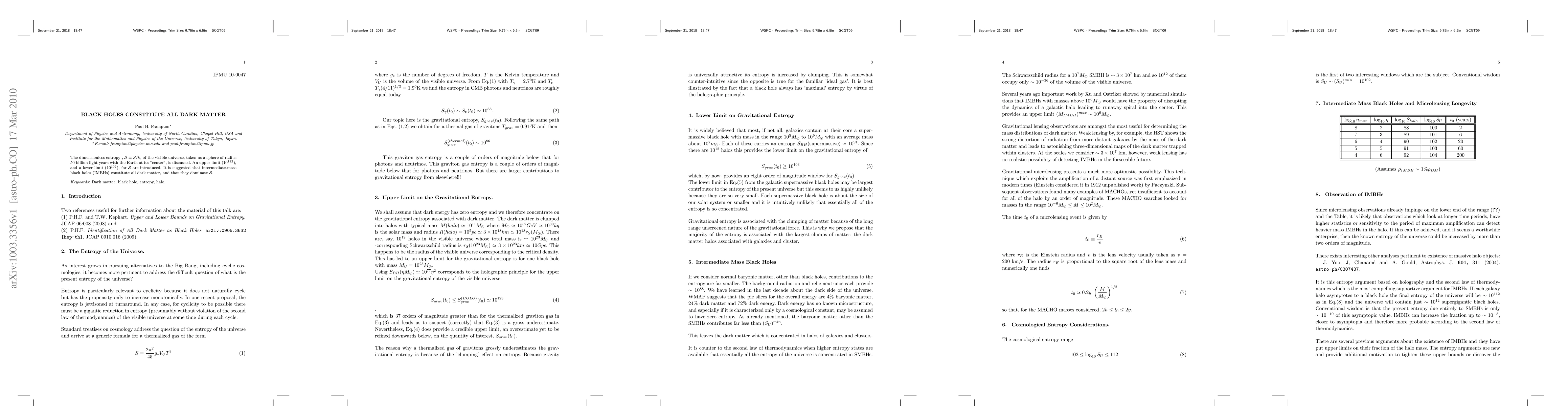 The dimensionless entropy, ${\cal S} \equiv S/k$, of the visible universe, taken as a sphere of radius 50 billion light years with the Earth at its "center", is discussed. An upper limit ($10^{112}$), and a lower limit ($10^{102}$), for ${\cal S}$ are introduced. It is suggested that intermediate-mass black holes (IMBHs) constitute all dark matter, and that they dominate ${\cal S}$.