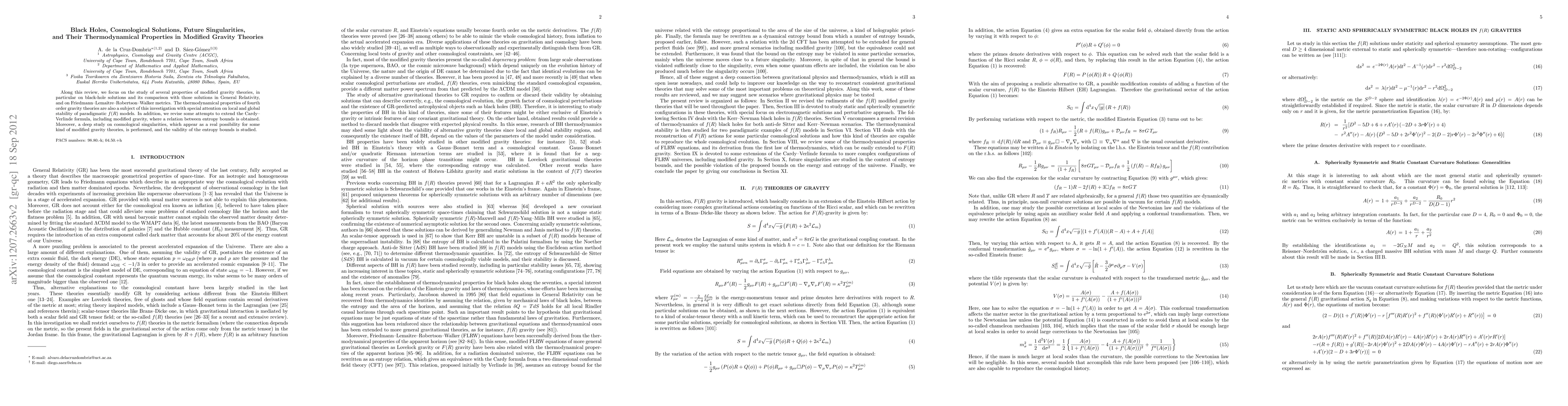 This paper reviews black-hole solutions and cosmological metrics in modified gravity theories, comparing them to General Relativity. It investigates the thermodynamical properties of fourth-order gravity and stability of f(R) models, extending the Cardy-Verlinde formula, and examines potential future singularities in the context of these theories.