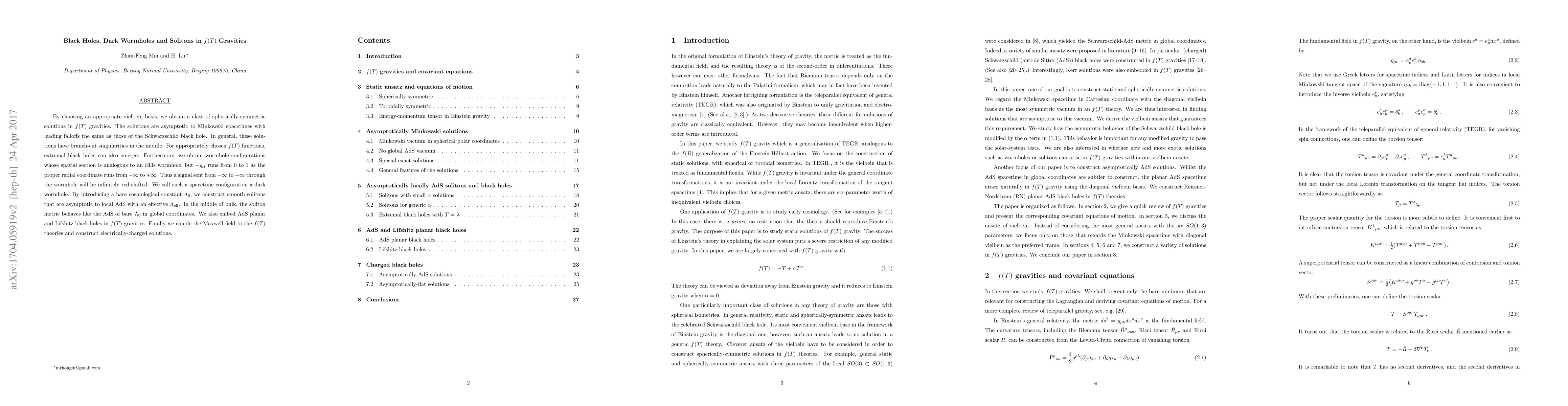 This paper explores spherically-symmetric solutions in $f(T)$ gravities, revealing black holes with branch-cut singularities and dark wormholes with infinite red-shift. It also introduces solitons asymptotic to local AdS and discusses electrically-charged solutions in $f(T)$ gravities.