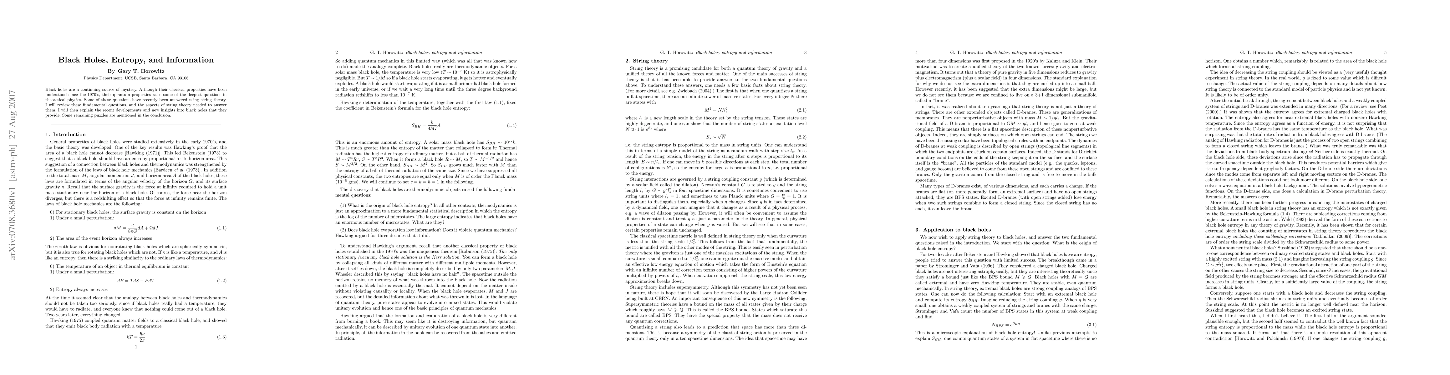 The paper introduces and applies string theory concepts, including string coupling, D-branes, and supersymmetry, to explain black hole entropy and resolve the information paradox, proposing the gauge/gravity correspondence as a potential holographic description of quantum gravity.