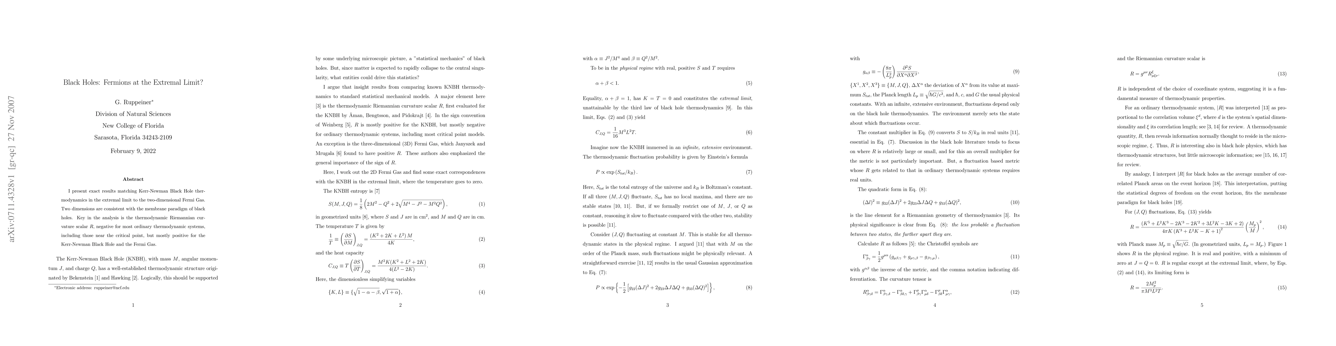 I present exact results matching Kerr-Newman Black Hole thermodynamics in the extremal limit to the two-dimensional Fermi Gas. Two dimensions are consistent with the membrane paradigm of black holes. Key in the analysis is the thermodynamic Riemannian curvature scalar $R$, negative for most ordinary thermodynamic systems, including those near the critical point, but mostly positive for the Kerr-Newman Black Hole and the Fermi Gas.
