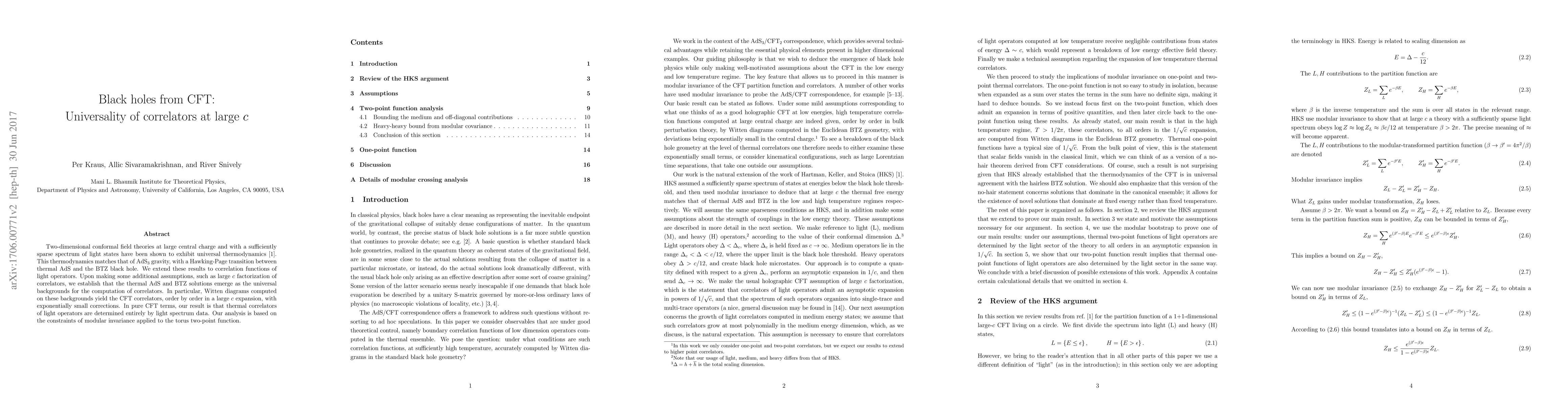 Summary: This paper demonstrates that two-dimensional conformal field theories (CFTs) with large central charge and sparse light spectra exhibit universal thermodynamic properties akin to AdS$_3$ gravity, and extends this universality to correlation functions, showing that thermal AdS and BTZ black hole solutions serve as universal backgrounds for correlator computations. Modular invariance constraints reveal that thermal correlators of light operators are determined solely by light spectrum data.