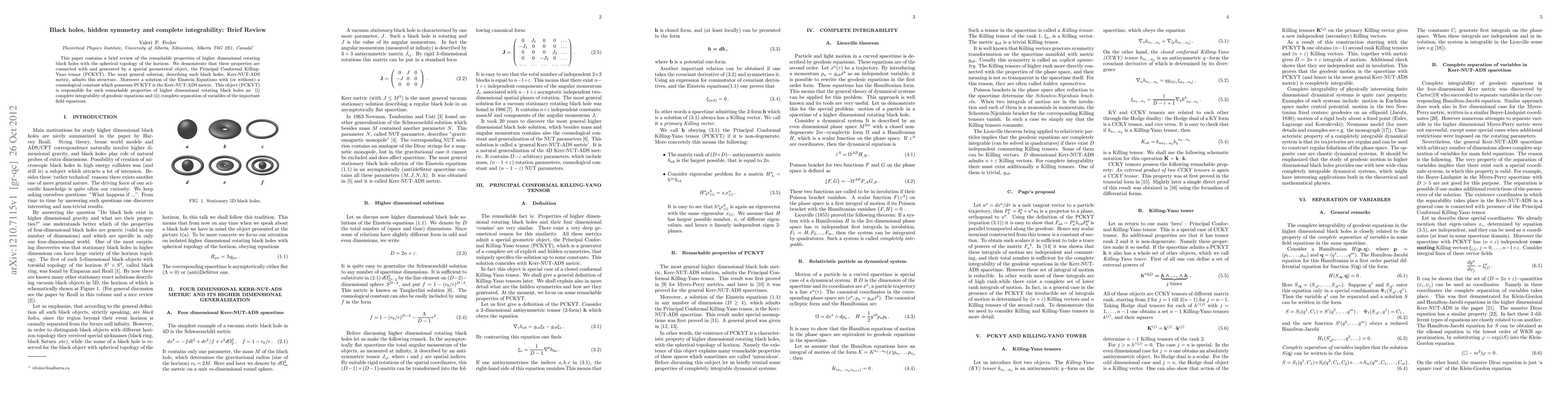 This paper reviews the unique properties of higher-dimensional rotating black holes, showing they are linked to the Principal Conformal Killing-Yano tensor (PCKYT). The Kerr-NUT-ADS metric, which includes this tensor, exhibits complete integrability of geodesics and complete separation of variables in field equations.