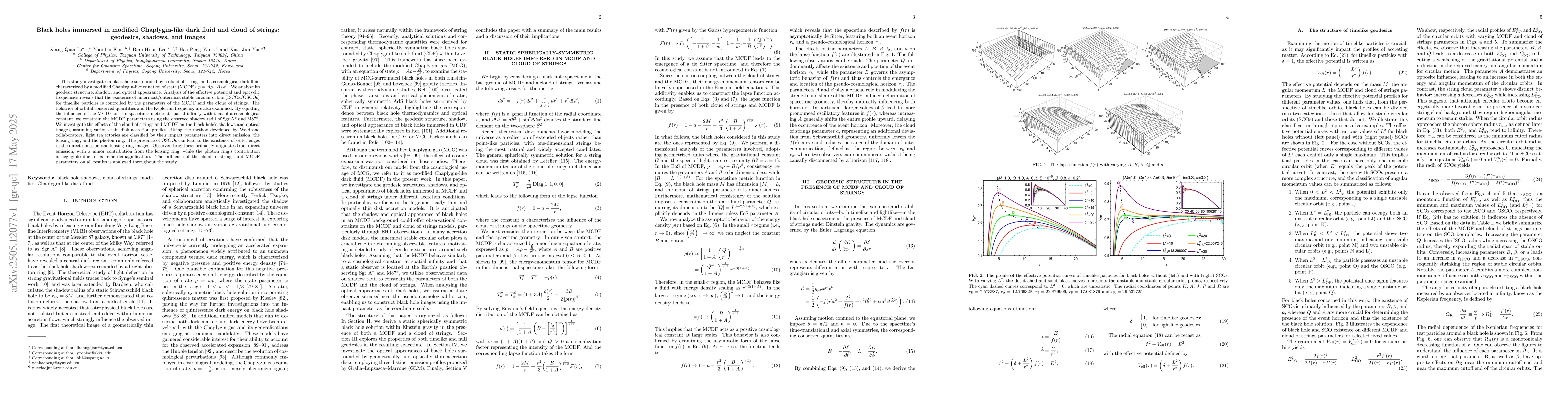 The paper presents a comprehensive analysis of geodesic motion, shadows, and optical appearances of black holes immersed in a modified Chaplygin-like dark fluid and a cloud of strings, employing advanced mathematical techniques and classifying light trajectories.