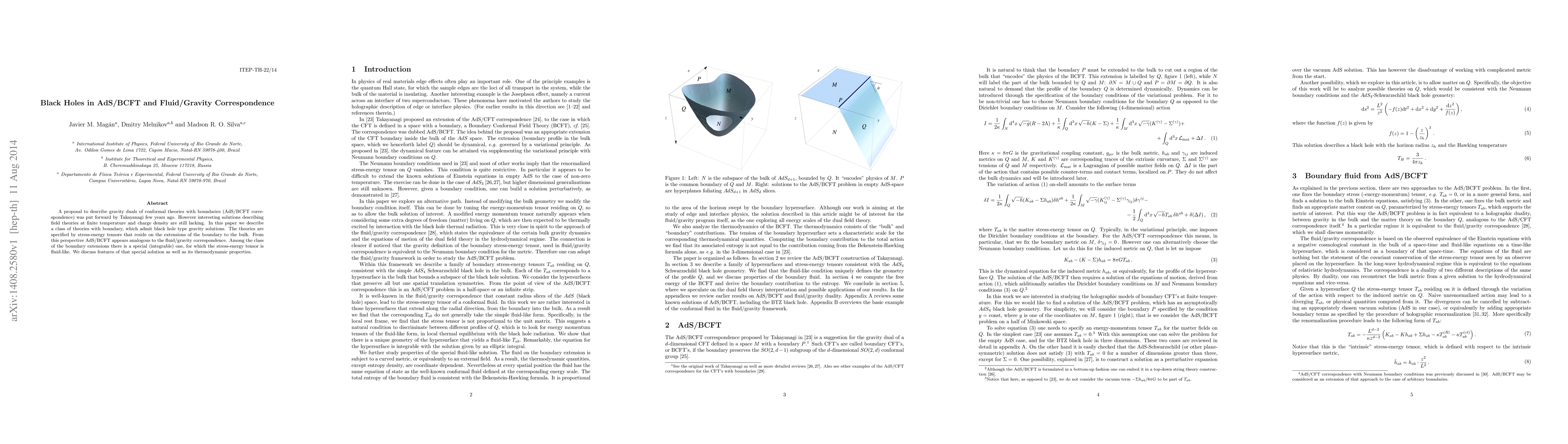A proposal to describe gravity duals of conformal theories with boundaries (AdS/BCFT correspondence) was put forward by Takayanagi few years ago. However interesting solutions describing field theories at finite temperature and charge density are still lacking. In this paper we describe a class of theories with boundary, which admit black hole type gravity solutions. The theories are specified by stress-energy tensors that reside on the extensions of the boundary to the bulk. From this perspective AdS/BCFT appears analogous to the fluid/gravity correspondence. Among the class of the boundary extensions there is a special (integrable) one, for which the stress-energy tensor is fluid-like. We discuss features of that special solution as well as its thermodynamic properties.