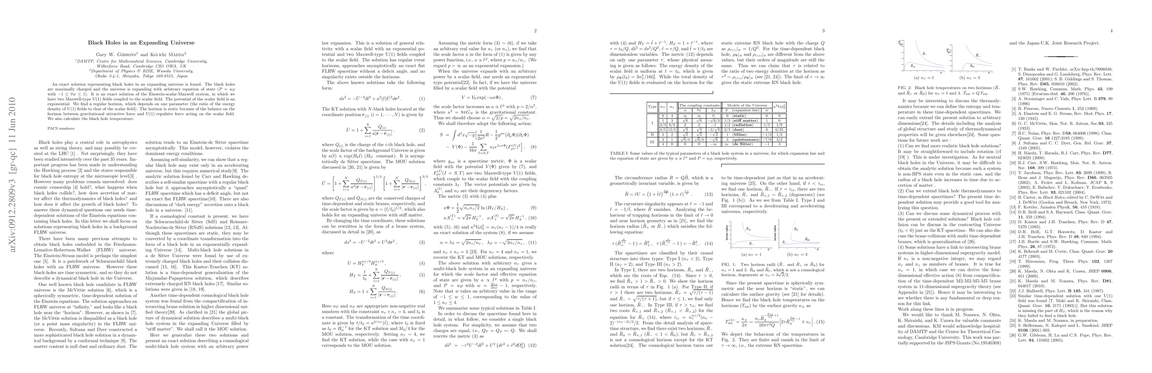 An exact solution representing black holes in an expanding universe is found. The black holes are maximally charged and the universe is expanding with arbitrary equation of state. It is an exact solution of the Einstein-scalar-Maxwell system, in which we have two Maxwell-type U(1) fields coupled to the scalar field. The potential of the scalar field is an exponential. We find a regular horizon, which depends on one parameter (the ratio of the energy density of U(1) fields to that of the scalar field). The horizon is static because of the balance on the horizon between gravitational attractive force and U(1) repulsive force acting on the scalar field. We also calculate the black hole temperature.