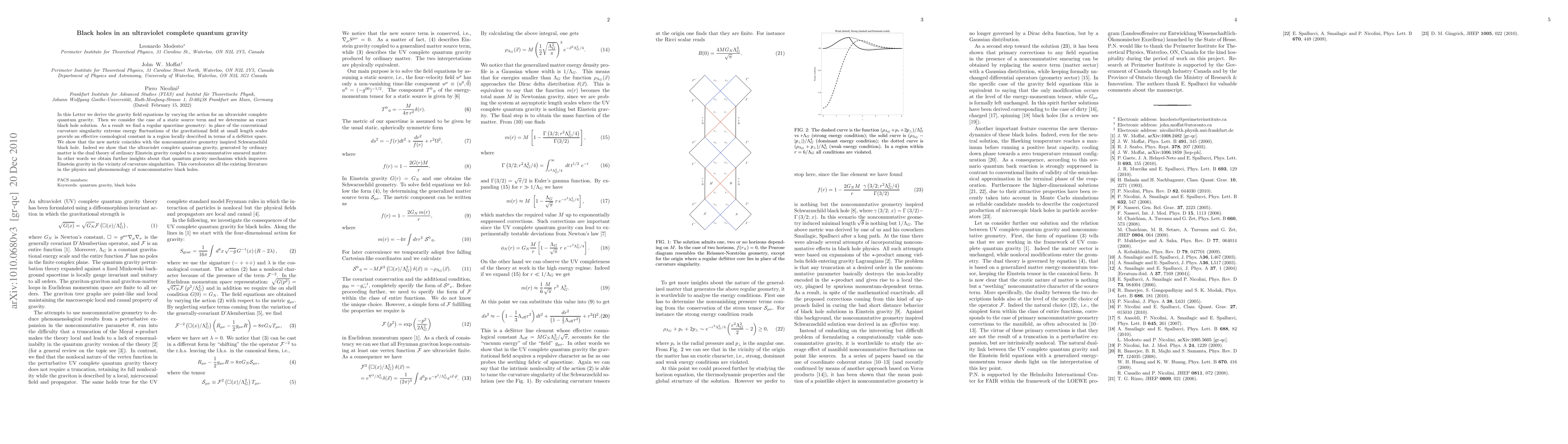 In this Letter we derive the gravity field equations by varying the action for an ultraviolet complete quantum gravity. Then we consider the case of a static source term and we determine an exact black hole solution. As a result we find a regular spacetime geometry: in place of the conventional curvature singularity extreme energy fluctuations of the gravitational field at small length scales provide an effective cosmological constant in a region locally described in terms of a de Sitter space. We show that the new metric coincides with the noncommutative geometry inspired Schwarzschild black hole. Indeed, we show that the ultraviolet complete quantum gravity, generated by ordinary matter is the dual theory of ordinary Einstein gravity coupled to a noncommutative smeared matter. In other words we obtain further insights about that quantum gravity mechanism which improves Einstein gravity in the vicinity of curvature singularities. This corroborates all the existing literature in the physics and phenomenology of noncommutative black holes.