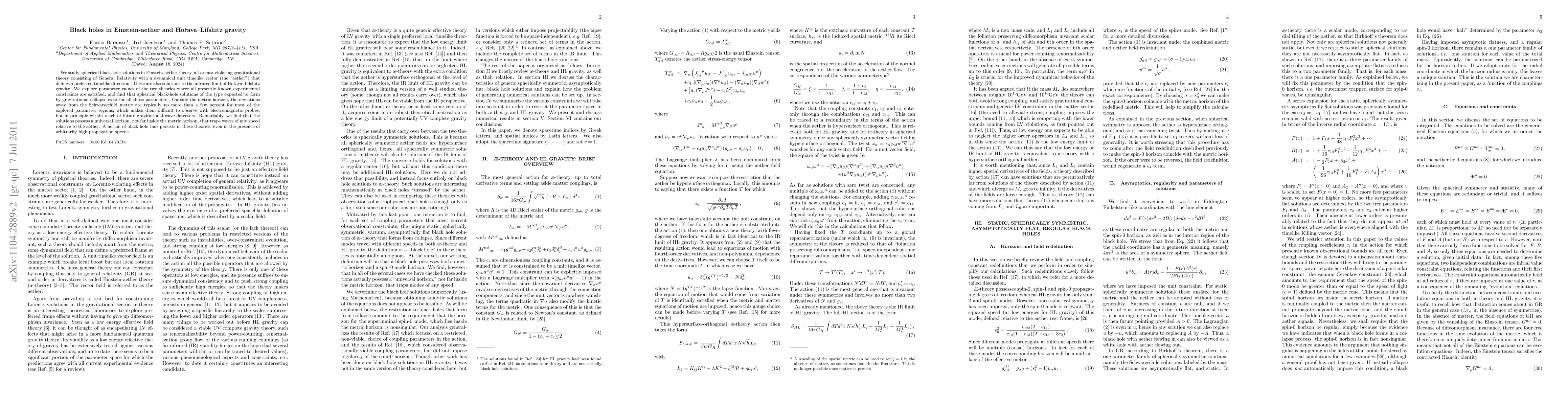 This paper investigates spherical black-hole solutions in Einstein-aether and Horava-Lifshitz gravity, finding that these solutions exist within experimental constraints and exhibit deviations from the Schwarzschild metric of typically no more than a few percent. The solutions possess a universal horizon trapping waves, maintaining a notion of black hole despite high propagation speeds.