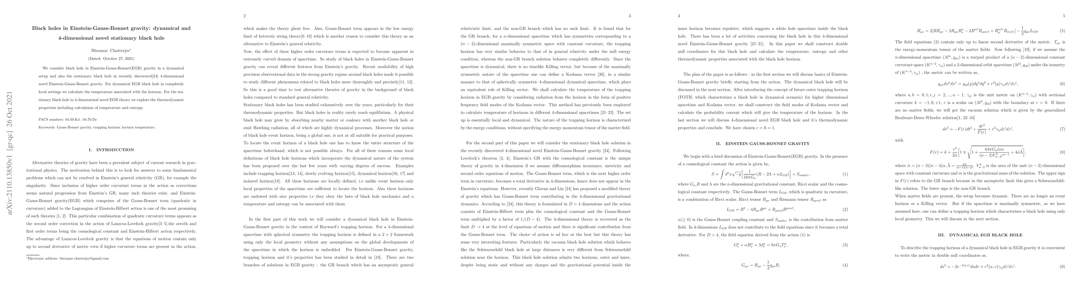 This paper examines black holes in the context of Einstein-Gauss-Bonnet (EGB) gravity, focusing on both dynamical and novel stationary black holes in 4-dimensional EGB theory. It computes the temperature for the dynamical EGB black hole and investigates thermodynamic properties, including temperature and entropy, for the stationary black hole.
