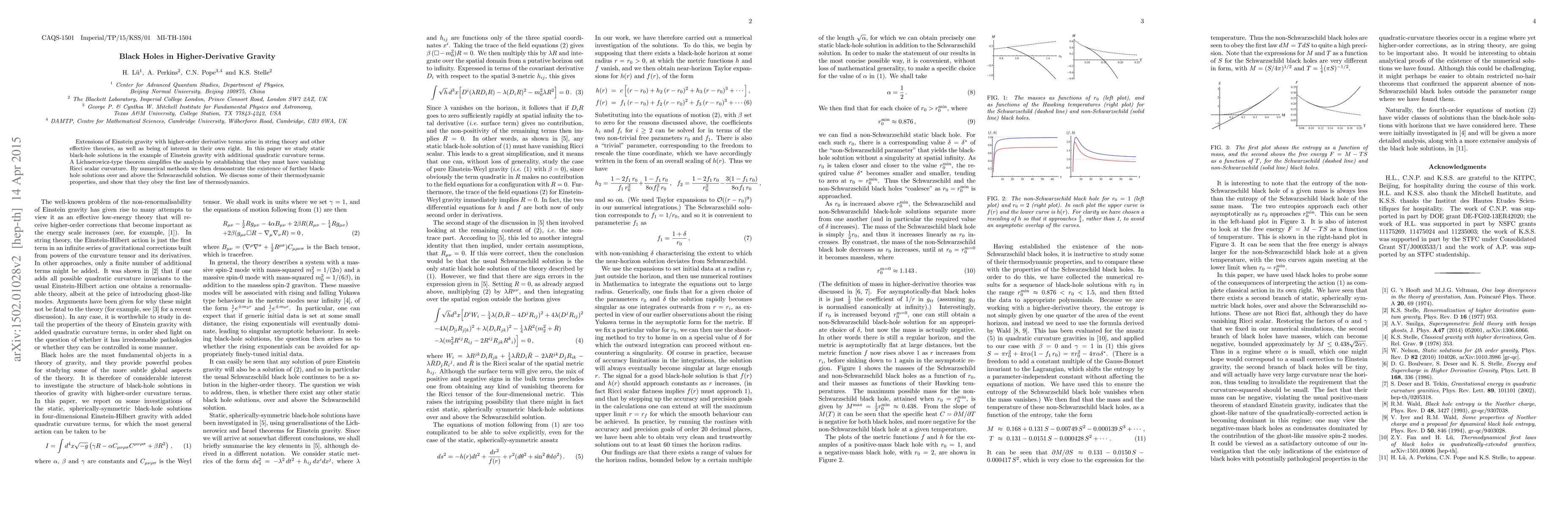 Extensions of Einstein gravity with higher-order derivative terms arise in string theory and other effective theories, as well as being of interest in their own right. In this paper we study static black-hole solutions in the example of Einstein gravity with additional quadratic curvature terms. A Lichnerowicz-type theorem simplifies the analysis by establishing that they must have vanishing Ricci scalar curvature. By numerical methods we then demonstrate the existence of further black-hole solutions over and above the Schwarzschild solution. We discuss some of their thermodynamic properties, and show that they obey the first law of thermodynamics.