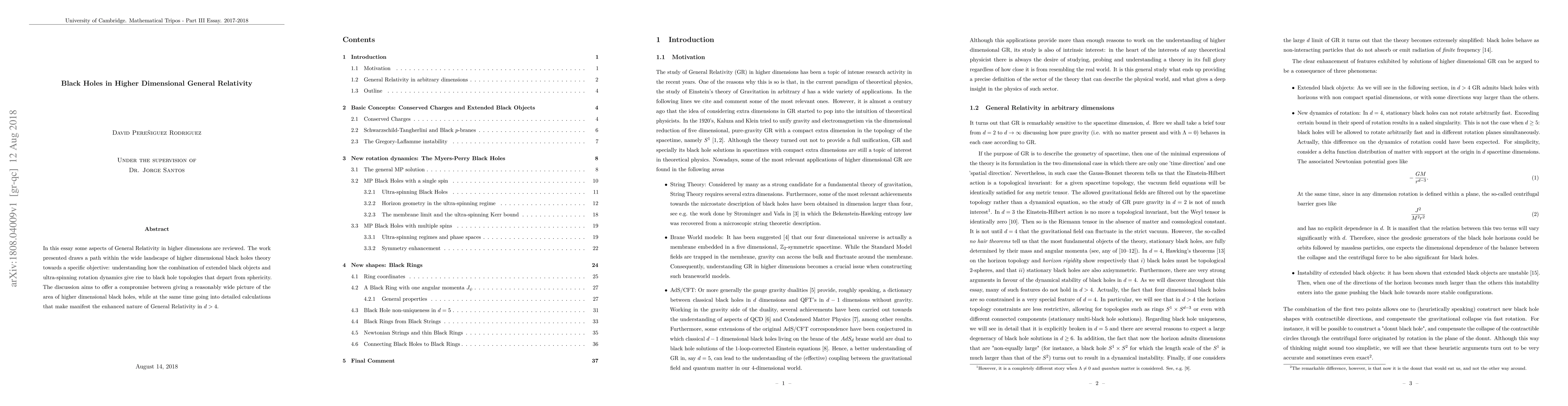 The research reviews aspects of General Relativity in higher dimensions, focusing on higher dimensional black holes and their rotation dynamics, specifically examining how extended black objects and ultra-spinning rotation can lead to non-spherical black hole topologies in dimensions greater than four.