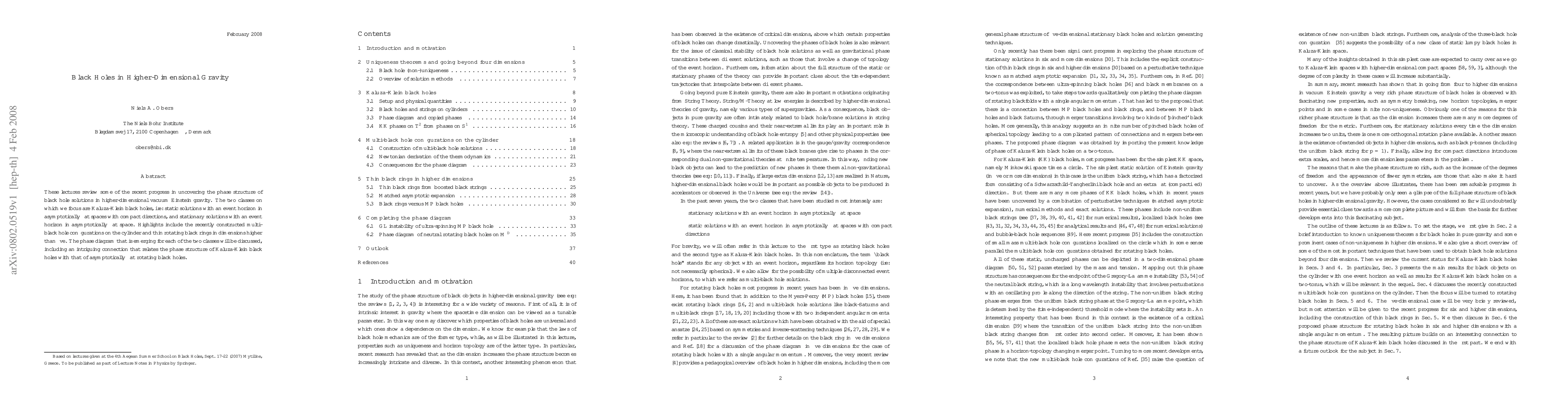 These lectures review some of the recent progress in uncovering the phase structure of black hole solutions in higher-dimensional vacuum Einstein gravity. The two classes on which we focus are Kaluza-Klein black holes, i.e. static solutions with an event horizon in asymptotically flat spaces with compact directions, and stationary solutions with an event horizon in asymptotically flat space. Highlights include the recently constructed multi-black hole configurations on the cylinder and thin rotating black rings in dimensions higher than five. The phase diagram that is emerging for each of the two classes will be discussed, including an intriguing connection that relates the phase structure of Kaluza-Klein black holes with that of asymptotically flat rotating black holes.