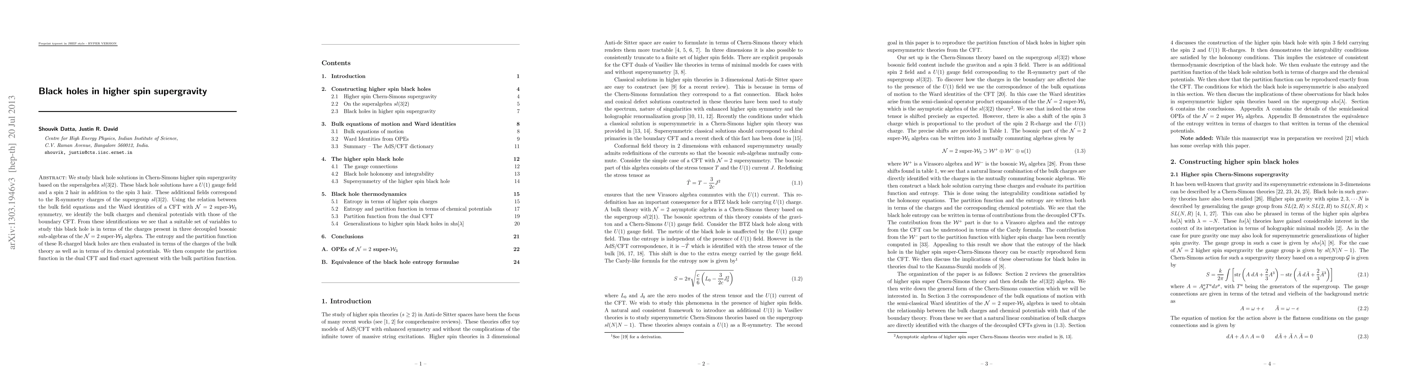 This paper investigates black hole solutions in higher spin supergravity with a focus on Chern-Simons formulations based on the superalgebra sl(3|2). It identifies the bulk charges and chemical potentials by relating field equations to Ward identities in a CFT with N=2 super-W_3 symmetry, and computes the entropy and partition function of these R-charged black holes, finding exact agreement between the bulk and dual CFT partition functions.