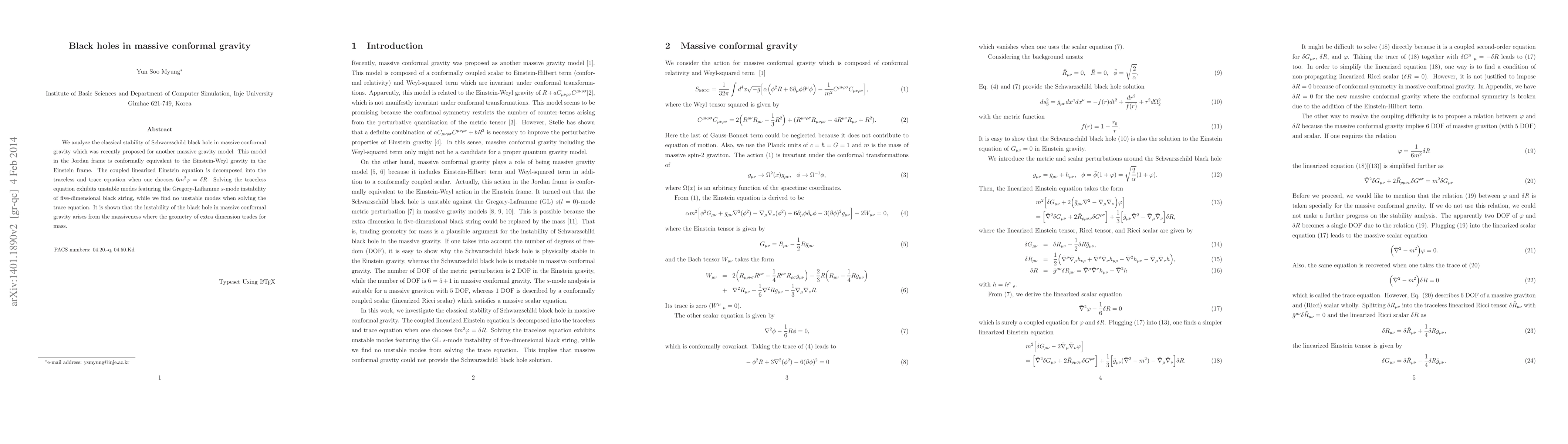 This paper investigates the classical stability of Schwarzschild black holes in massive conformal gravity, revealing unstable modes indicative of Gregory-Laflamme $s$-mode instability, while no such instabilities are found in the trace equation, suggesting the instability stems from the massiveness of the model.
