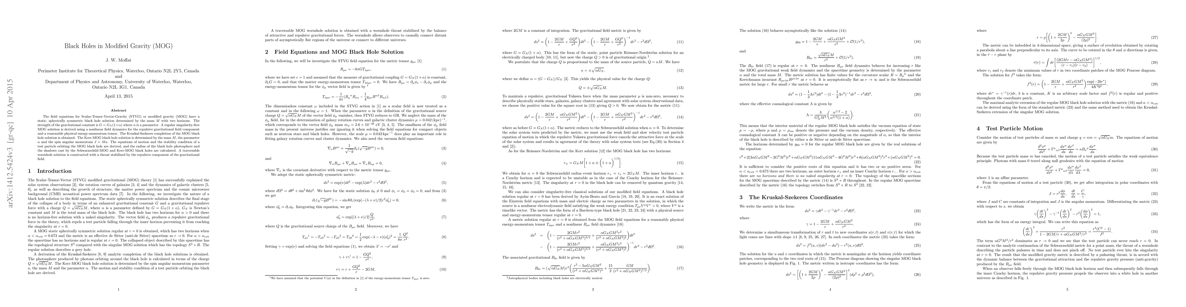 The field equations for Scalar-Tensor-Vector-Gravity (STVG) or modified gravity (MOG) have a static, spherically symmetric black hole solution determined by the mass $M$ with two horizons. The strength of the gravitational constant is $G=G_N(1+\alpha)$ where $\alpha$ is a parameter. A regular singularity-free MOG solution is derived using a nonlinear field dynamics for the repulsive gravitational field component and a reasonable physical energy-momentum tensor. The Kruskal-Szekeres completion of the MOG black hole solution is obtained. The Kerr-MOG black hole solution is determined by the mass $M$, the parameter $\alpha$ and the spin angular momentum $J=Ma$. The equations of motion and the stability condition of a test particle orbiting the MOG black hole are derived, and the radius of the black hole photosphere and the shadows cast by the Schwarzschild-MOG and Kerr-MOG black holes are calculated. A traversable wormhole solution is constructed with a throat stabilized by the repulsive component of the gravitational field.