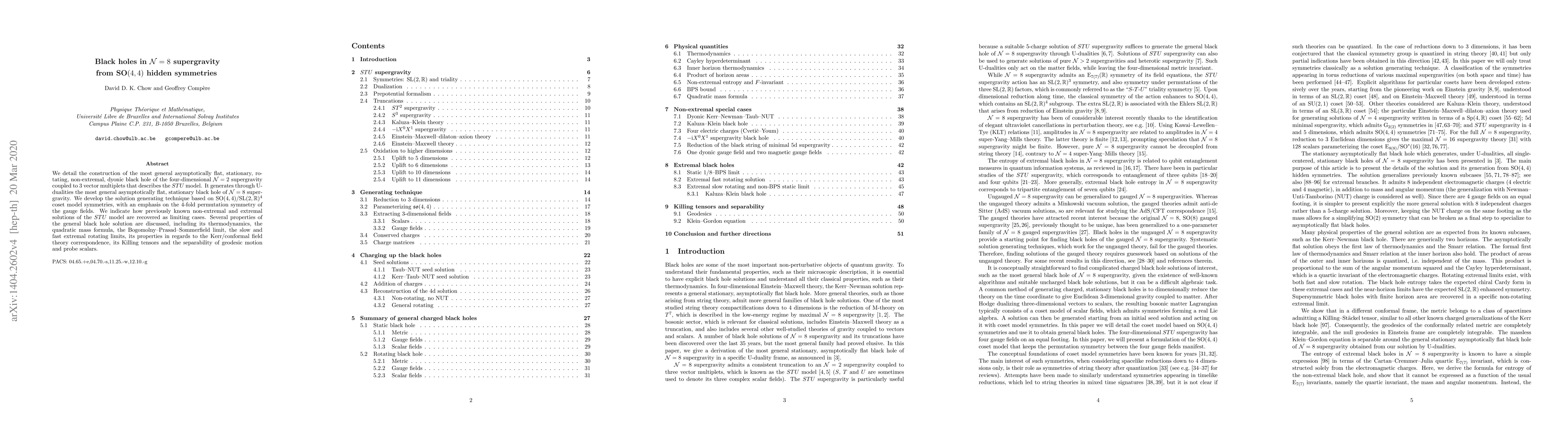 We detail the construction of the most general asymptotically flat, stationary, rotating, non-extremal, dyonic black hole of the four-dimensional N=2 supergravity coupled to 3 vector multiplets that describes the STU model. It generates through U-dualities the most general asymptotically flat, stationary black hole of N=8 supergravity. We develop the solution generating technique based on SO(4,4)/SL(2,R)^4 coset model symmetries, with an emphasis on the 4-fold permutation symmetry of the gauge fields. We indicate how previously known non-extremal and extremal solutions of the STU model are recovered as limiting cases. Several properties of the general black hole solution are discussed, including its thermodynamics, the quadratic mass formula, the Bogomolny-Prasad-Sommerfield limit, the slow and fast extremal rotating limits, its properties in regards to the Kerr/conformal field theory correspondence, its Killing tensors and the separability of geodesic motion and probe scalars.