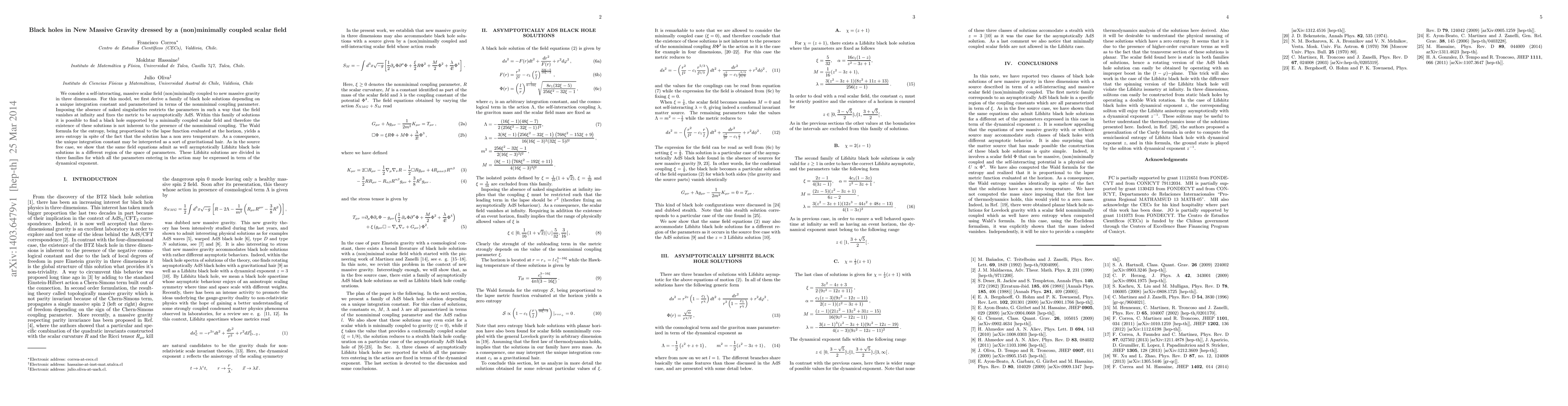 We consider a self-interacting, massive scalar field (non)minimally coupled to new massive gravity in three dimensions. For this model, we first derive a family of black hole solutions depending on a unique integration constant and parameterized in terms of the nonminimal coupling parameter. Imposing the absence of naked singularities restricts the parameters in such a way that the field vanishes at infinity and fixes the metric to be asymptotically AdS. Within this family of solutions it is possible to find a black hole supported by a minimally coupled scalar field and therefore the existence of these solutions is not inherent to the presence of the nonminimal coupling. The Wald formula for the entropy, being proportional to the lapse function evaluated at the horizon, yields a zero entropy in spite of the fact that the solution has a non zero temperature. As a consequence, the unique integration constant may be interpreted as a sort of gravitational hair. As in the source free case, we show that the same field equations admit as well asymptotically Lifshitz black hole solutions in a different region of the space of parameters. These Lifshitz solutions are divided in three families for which all the parameters entering in the action may be expressed in term of the dynamical exponent.