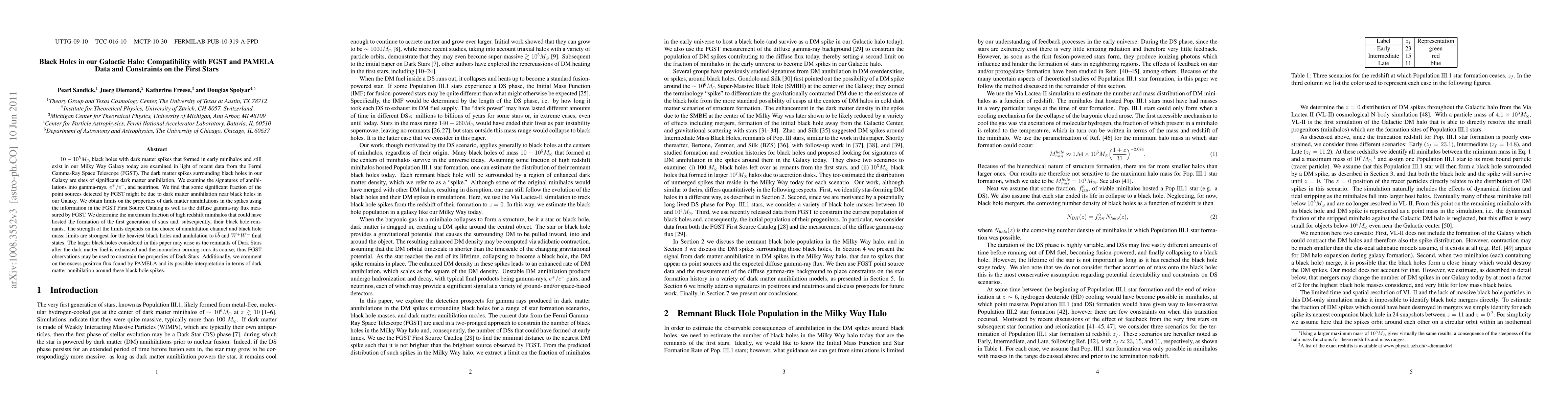10 to 10^5 solar mass black holes with dark matter spikes that formed in early minihalos and still exist in our Milky Way Galaxy today are examined in light of recent data from the Fermi Gamma-Ray Space Telescope (FGST). The dark matter spikes surrounding black holes in our Galaxy are sites of significant dark matter annihilation. We examine the signatures of annihilations into gamma-rays, electrons and positrons, and neutrinos. We find that some significant fraction of the point sources detected by FGST might be due to dark matter annihilation near black holes in our Galaxy. We obtain limits on the properties of dark matter annihilations in the spikes using the information in the FGST First Source Catalog as well as the diffuse gamma-ray flux measured by FGST. We determine the maximum fraction of high redshift minihalos that could have hosted the formation of the first generation of stars and, subsequently, their black hole remnants. The strength of the limits depends on the choice of annihilation channel and black hole mass; limits are strongest for the heaviest black holes and annhilation to $b \bar{b}$ and $W^+W^-$ final states. The larger black holes considered in this paper may arise as the remnants of Dark Stars after the dark matter fuel is exhausted and thermonuclear burning runs its course; thus FGST observations may be used to constrain the properties of Dark Stars. Additionally, we comment on the excess positron flux found by PAMELA and its possible interpretation in terms of dark matter annihilation around these black hole spikes.