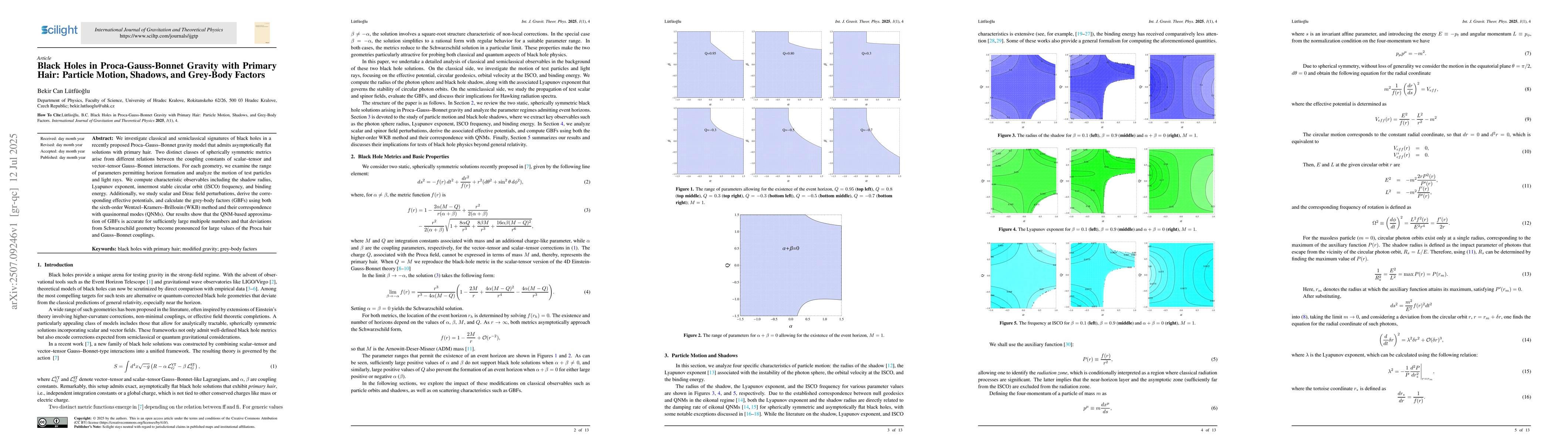 We investigate classical and semiclassical signatures of black holes in a recently proposed Proca-Gauss-Bonnet gravity model that admits asymptotically flat solutions with primary hair. Two distinct classes of spherically symmetric metrics arise from different relations between the coupling constants of scalar-tensor and vector-tensor Gauss-Bonnet interactions. For each geometry, we examine the range of parameters permitting horizon formation and analyze the motion of test particles and light rays. We compute characteristic observables including the shadow radius, Lyapunov exponent, innermost stable circular orbit (ISCO) frequency, and binding energy. Additionally, we study scalar and Dirac field perturbations, derive the corresponding effective potentials, and calculate the grey-body factors (GBFs) using both the sixth-order Wentzel-Kramers-Brillouin (WKB) method and their correspondence with quasinormal modes (QNMs). Our results show that the QNM-based approximation of GBFs is accurate for sufficiently large multipole numbers and that deviations from Schwarzschild geometry become pronounced for large values of the Proca hair and Gauss-Bonnet couplings.