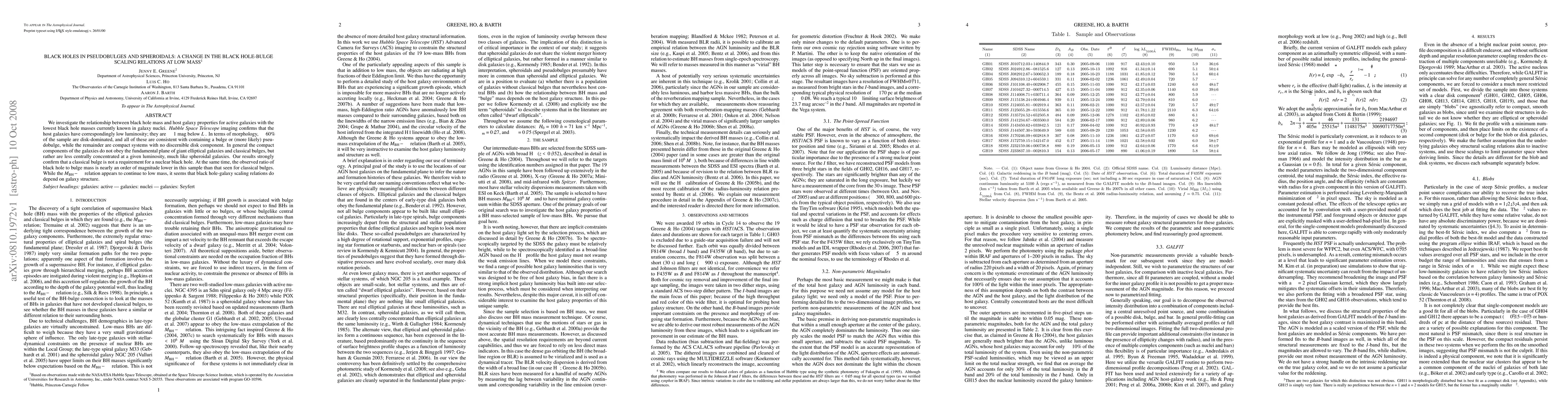 We investigate the relationship between black hole mass and host galaxy properties for active galaxies with the lowest black hole masses currently known in galaxy nuclei. Hubble Space Telescope imaging confirms that the host galaxies have correspondingly low luminosity; they are ~1 mag below L*. In terms of morphology, ~60% of the members of the sample are disk-dominated, and all of these are consistent with containing a bulge or (more likely) pseudobulge, while the remainder are compact systems with no discernible disk component. In general the compact components of the galaxies do not obey the fundamental plane of giant elliptical galaxies and classical bulges, but rather are less centrally concentrated at a given luminosity, much like spheroidal galaxies. Our results strongly confirm that a classical bulge is not a requirement for a nuclear black hole. At the same time, the observed ratio of black hole to bulge mass is nearly an order of magnitude lower in this sample than that seen for classical bulges. While the M-sigma relation appears to continue to low mass, it seems that black hole-galaxy scaling relations do depend on galaxy structure.