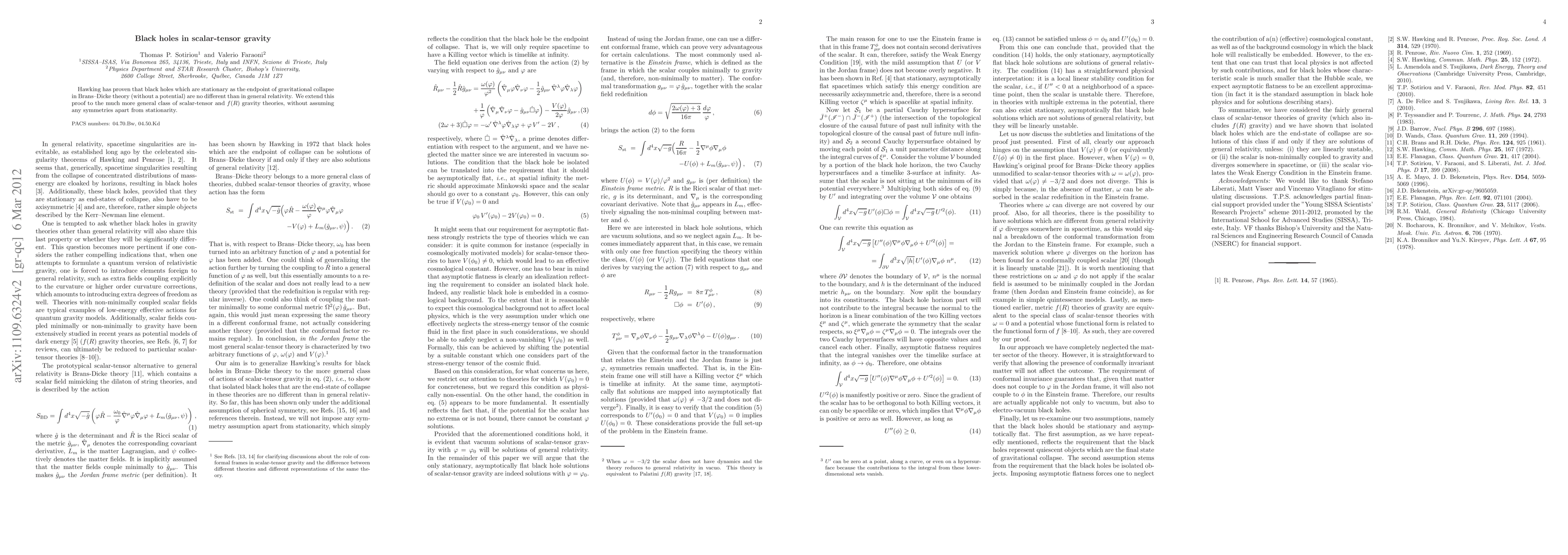 Hawking has proven that black holes which are stationary as the endpoint of gravitational collapse in Brans--Dicke theory (without a potential) are no different than in general relativity. We extend this proof to the much more general class of scalar-tensor and f(R) gravity theories, without assuming any symmetries apart from stationarity.