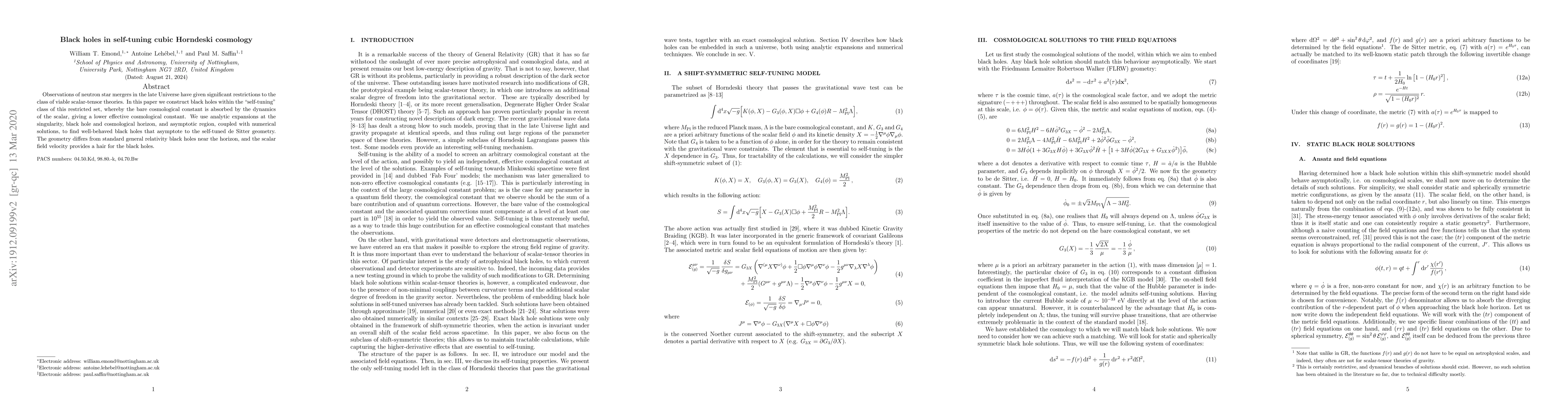 This paper explores black holes in a self-tuning cubic Horndeski cosmology, where the effective cosmological constant is reduced by scalar dynamics. It employs analytic and numerical methods to find black holes that asymptote to a self-tuned de Sitter geometry, differing from standard general relativity black holes near the horizon due to the scalar field's influence.