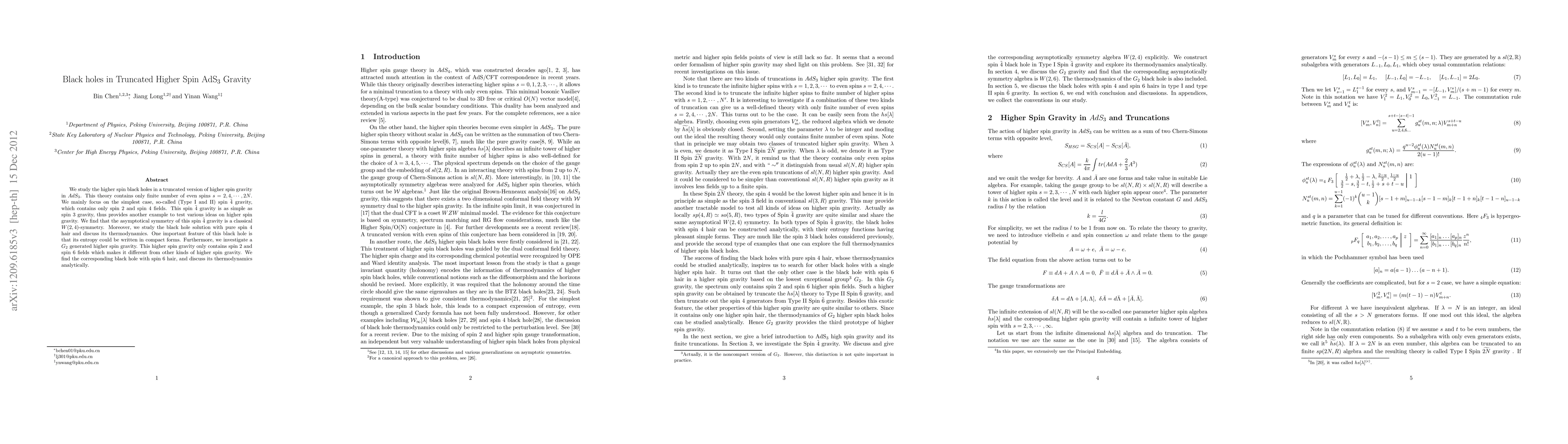This paper investigates higher spin black holes in truncated higher spin gravity in $AdS_3$, focusing on spin ${\tilde 4}$ and $G_2$ generated higher spin theories. It reveals that the asymptotic symmetry is a classical W(2,4)-symmetry and identifies unique black holes with spin 4 or spin 6 hair, discussing their thermodynamic properties.
