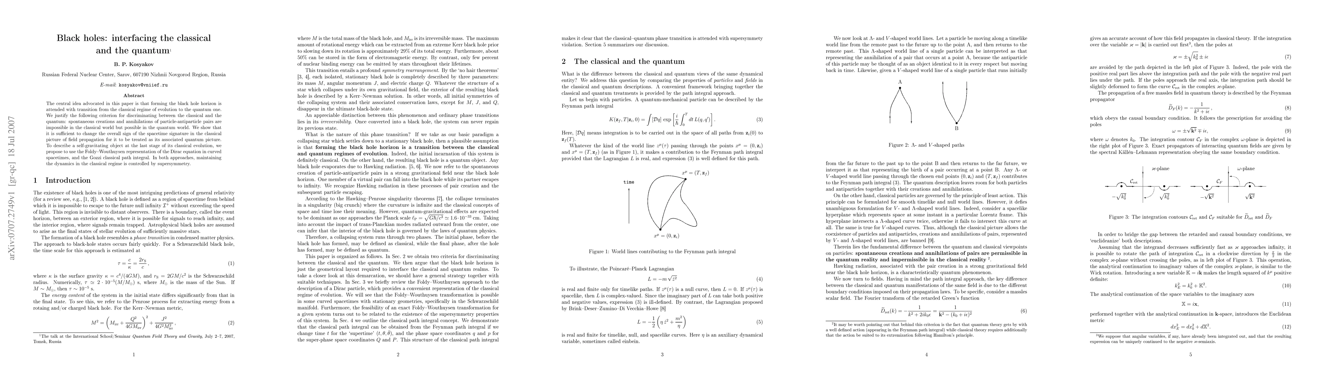 This paper argues that the formation of a black hole horizon marks a transition from classical to quantum regimes, justified by the possibility of particle-antiparticle pair creation and annihilation in quantum mechanics. It proposes using the Foldy-Wouthuysen representation and Gozzi classical path integral to describe the final stages of a self-gravitating object's evolution, with dynamics in the classical regime controlled by supersymmetry.