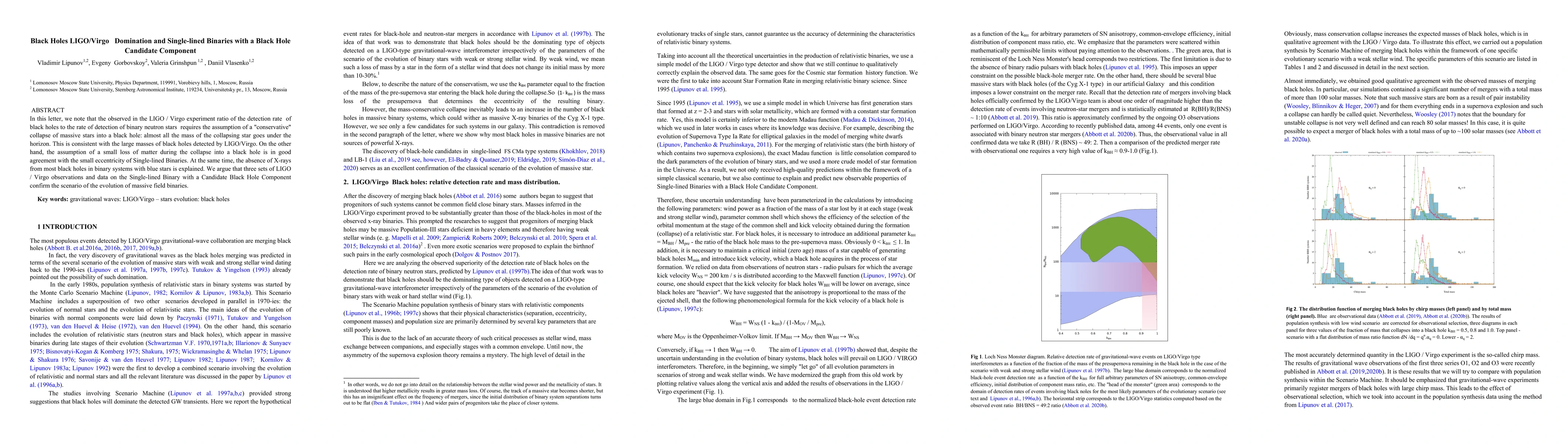 In this letter, we note that the observed in the LIGO / Virgo experiment ratio of the detection rate of black holes to the rate of detection of binary neutron stars requires the assumption of a "conservative" collapse of massive stars into a black hole: almost all the mass of the collapsing star goes under the horizon. This is consistent with the large masses of black holes detected by LIGO/Virgo. On the other hand, the assumption of a small loss of matter during the collapse into a black hole is in good agreement with the small eccentricity of Single-lined Binaries. At the same time, the absence of X-rays from most black holes in binary systems with blue stars is explained. We argue that three sets of LIGO / Virgo observations and data on the Single-lined Binary with a Candidate Black Hole Component confirm the scenario of the evolution of massive field binaries.