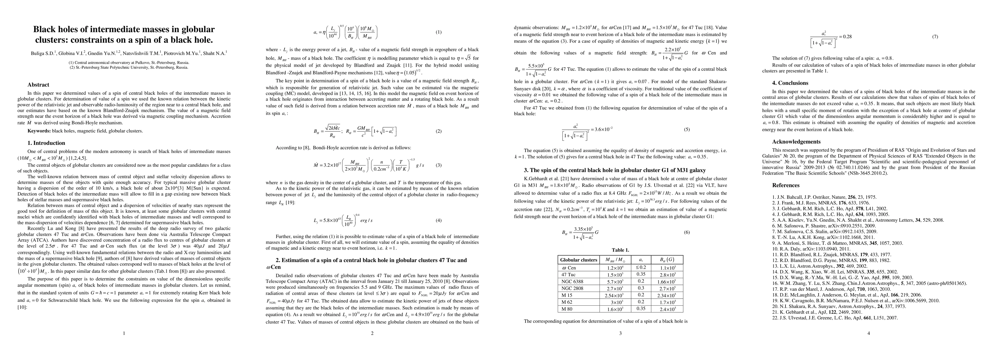 In this paper we determined values of a spin of central black holes of the intermediate masses in globular clusters. For determination of value of a spin we used the known relation between the kinetic power of the relativistic jet and observable radio-luminosity of the region near to a central black hole, and our estimates have based on the known Blandford-Znajek mechanism. The value of a magnetic field strength near the event horizon of a black hole was derived via magnetic coupling mechanism. Accretion rate was derived using Bondi-Hoyle mechanism.