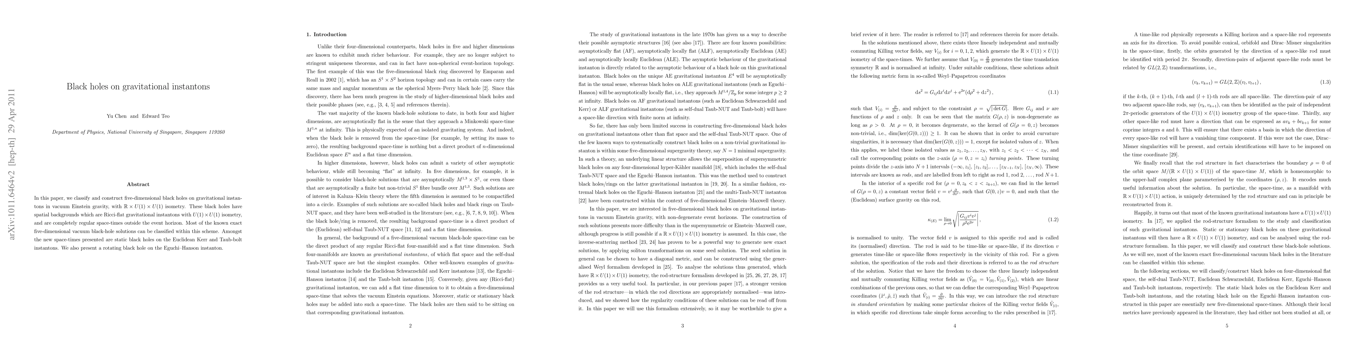In this paper, we classify and construct five-dimensional black holes on gravitational instantons in vacuum Einstein gravity, with RxU(1)xU(1) isometry. These black holes have spatial backgrounds which are Ricci-flat gravitational instantons with U(1)xU(1) isometry, and are completely regular space-times outside the event horizon. Most of the known exact five-dimensional vacuum black-hole solutions can be classified within this scheme. Amongst the new space-times presented are static black holes on the Euclidean Kerr and Taub-bolt instantons. We also present a rotating black hole on the Eguchi-Hanson instanton.